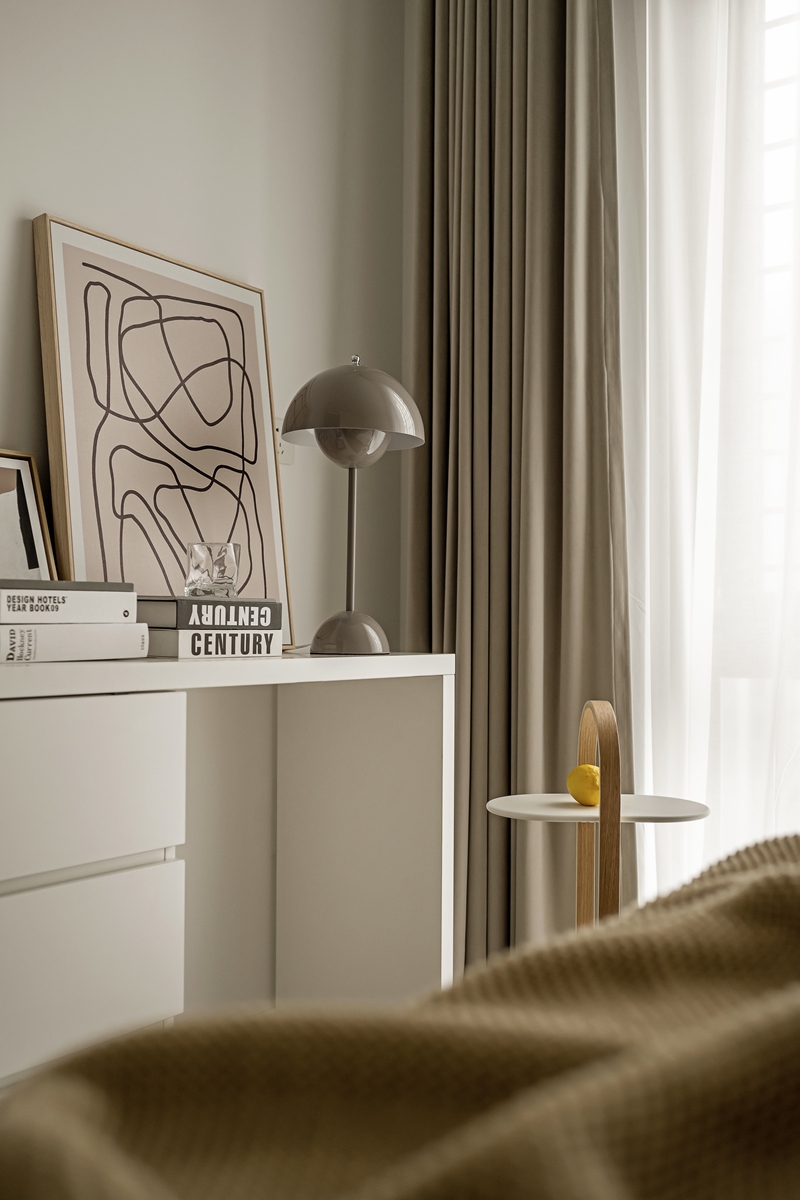 浅灰床头与棉麻床品,在光影中晕出慵懒质感;棕色针织毯的肌理,为空间增添触觉温度。床边小几的大理石纹理与极简造型,让“休憩”也成为兼具美学与舒适的体验,每一个清晨与夜晚,都在此被温柔接住。