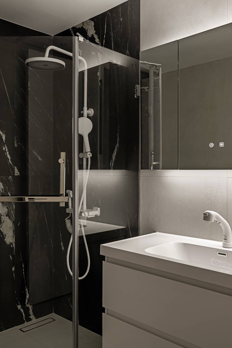 深色大理石墙面如泼墨画般深邃,与纯白卫浴设施形成强烈视觉反差,却在灯光的晕染下达成和谐。玻璃隔断让空间更显通透,每一次沐浴,都成为褪去疲惫、重获平静的私密仪式。