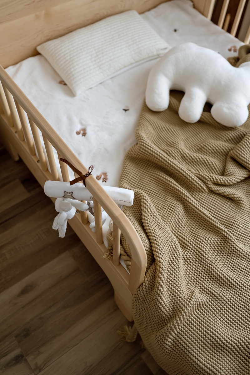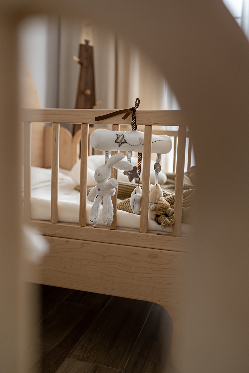 浅木色婴儿床与家具,带着天然原木的肌理温度,为孩子构筑安全柔软的成长天地。透光纱帘与棉麻织物的搭配,让阳光与微风成为房间的“常客”,每一处细节都在诉说:童年本该被这样的温柔包裹。