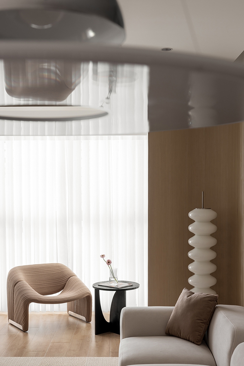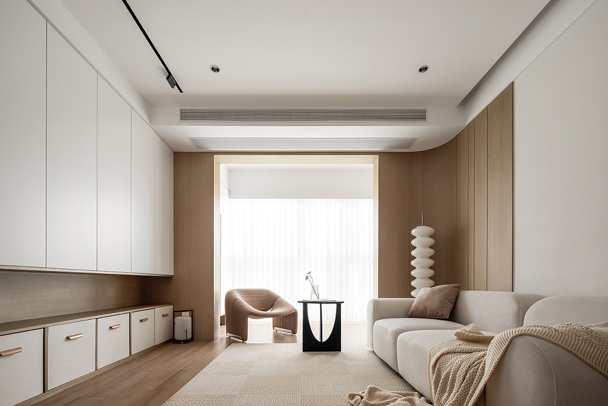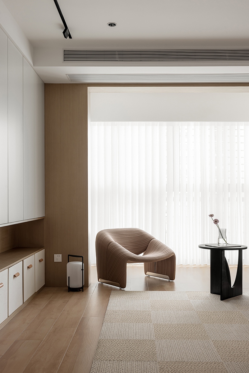 木色与白色的材质对话,在沙发、单人椅的柔化轮廓中更显温润。整墙柜体藏起琐碎,只留光线透过纱帘漫入,搭配螺旋灯与编织毯,把“放空”的松弛感刻进日常。
