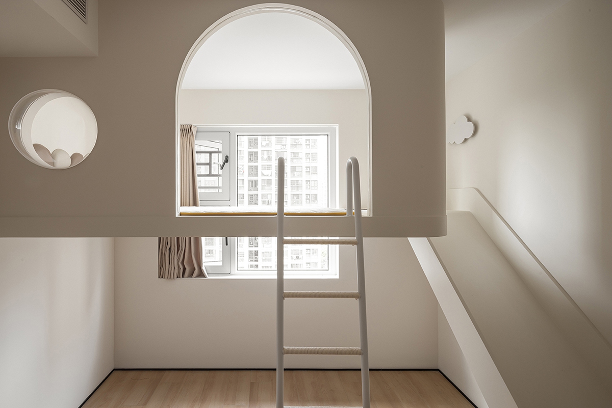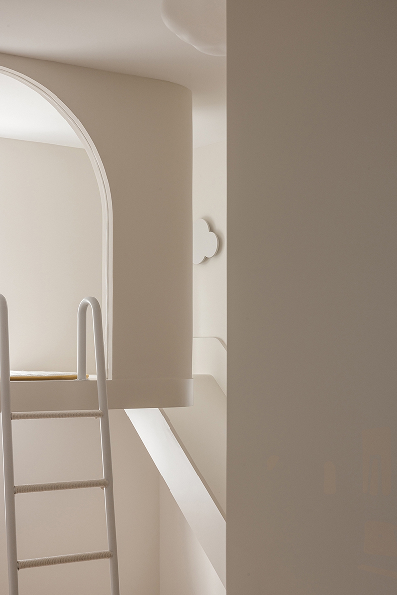 儿童区用拱形门洞、滑梯与梯架构建“秘密小天地”,柔和奶油色包裹空间,云朵装饰与圆形镜增添天真意趣;同时借由利落线条与一体化设计,让童趣不再杂乱,而是成为空间的灵动注脚。