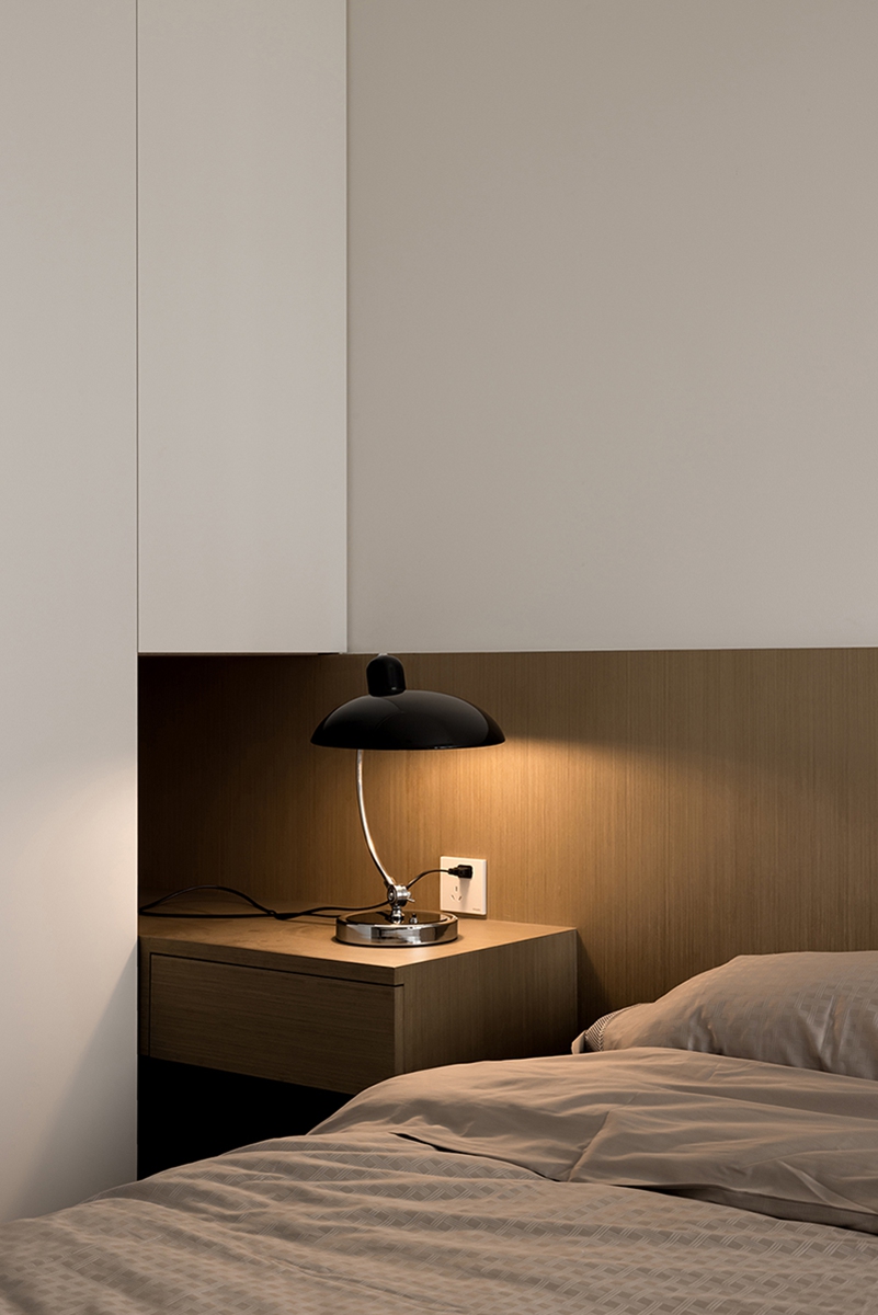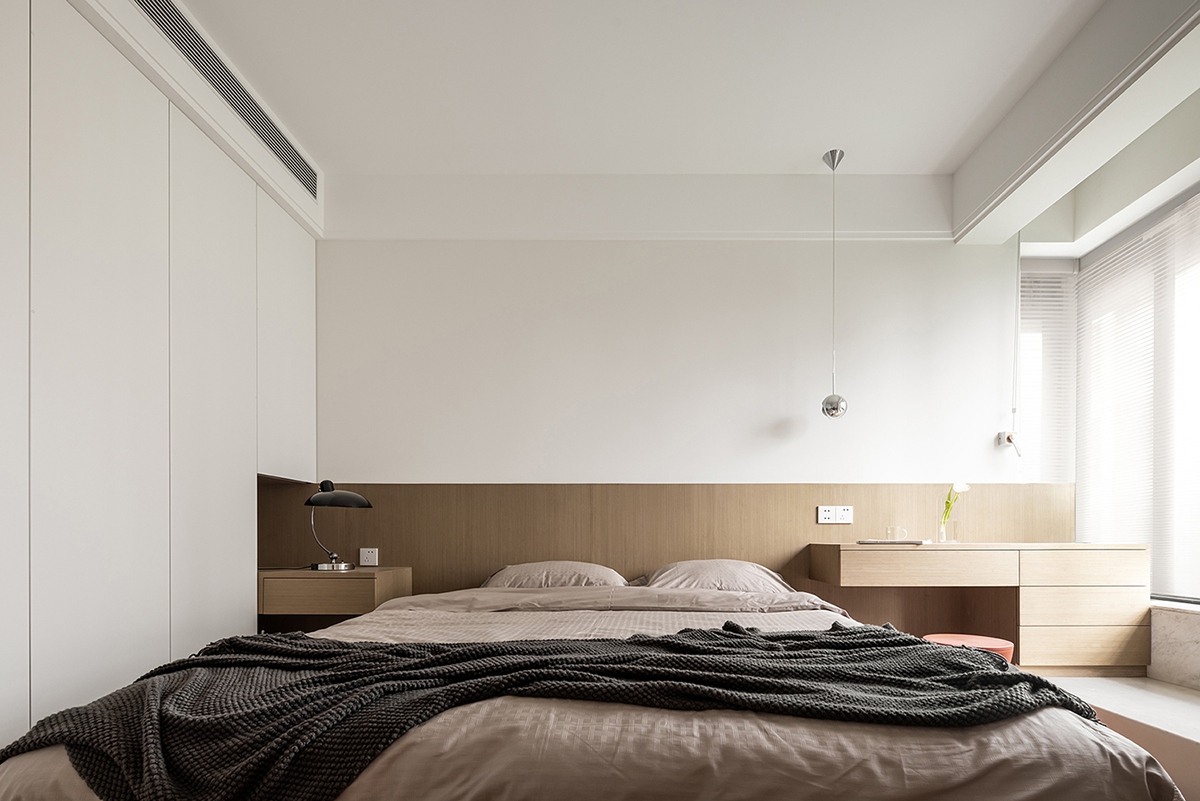 木调床头墙温柔包裹睡眠区,极简柜体收纳一切喧嚣,窗边书桌借自然光铺就工作与阅读的宁静场景,一毯一灯,都是卸下疲惫的温柔信号。