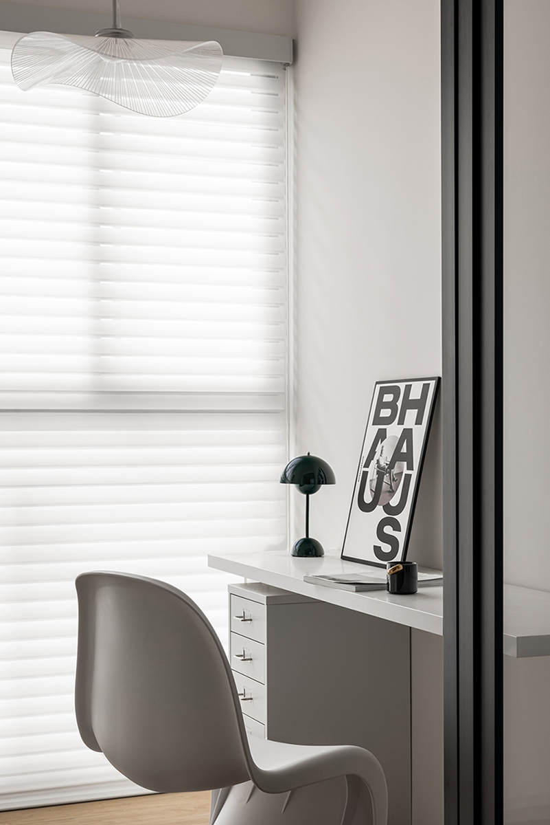 玻璃隔断模糊空间边界,百叶帘滤过的光线轻洒在流线型座椅与极简置物架上,让专注与创意在通透场域里自由生长。