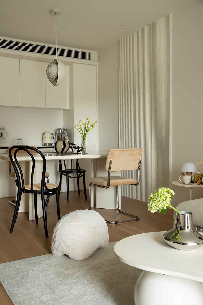 开放式餐厨以白调橱柜营造清爽感,个性吊灯如艺术装置点亮空间;不同材质的餐椅混搭出随性趣味,咖啡器具与鲜花错落陈列,让下厨、用餐都成为值得慢享的日常仪式。