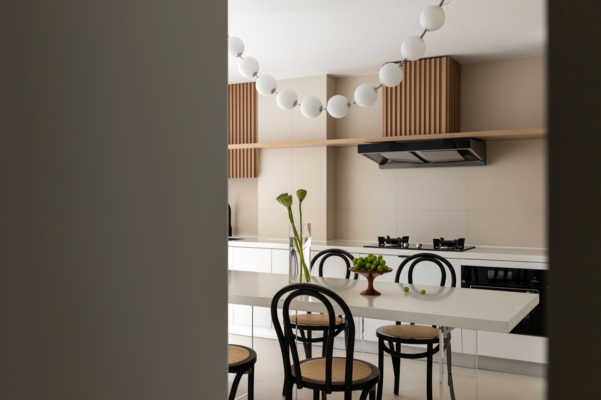 开放式餐厨以白色柜体构建秩序感,木质格栅为空间注入暖调呼吸;球形吊灯如艺术装置悬于餐桌之上,黑框餐椅的复古线条与通透台面碰撞,让下厨、用餐的每一刻,都在理性设计里生长出生活温度。