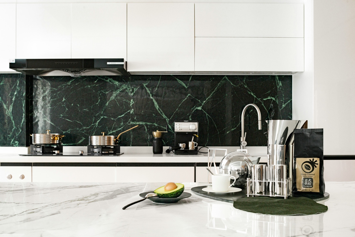 白釉橱柜的极简线条,托举起墨绿大理石的“自然画布”,锅具的金属冷光与咖啡器具的精致轮廓,在台面交织成生活的仪式感。半切牛油果的清新、咖啡豆袋的醇香,让理性的烹饪空间生长出感官的温度——当烟火气邂逅艺术感,厨房便成了酿造“美味美学”的秘密基地。