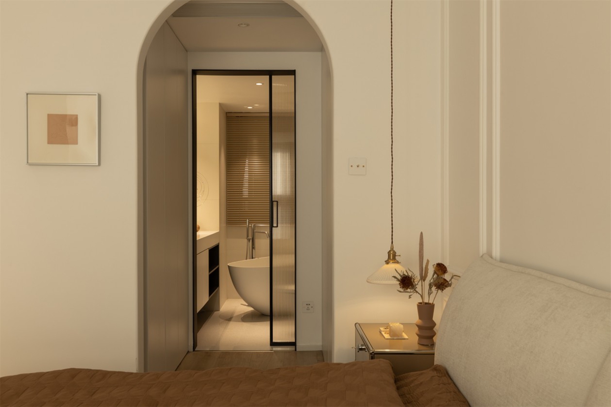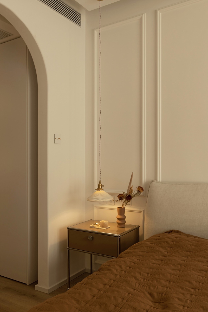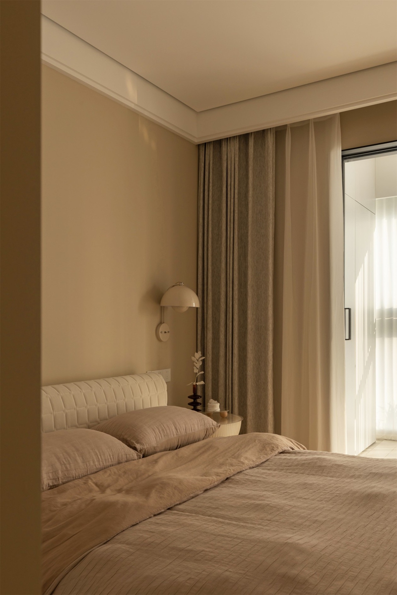 奶咖色墙面如被阳光烘暖的羊绒,包裹住整个睡眠空间。绗缝床头的细腻纹路,与亚麻床品的质朴肌理相映成趣;壁灯的柔光漫过窗帘的绒面质感,将室外光线滤成温柔的纱——当身体陷入床榻,暖棕调的每一处细节都在说:“晚安,把疲惫交给这盏光,醒来时,阳光会替我吻你。”