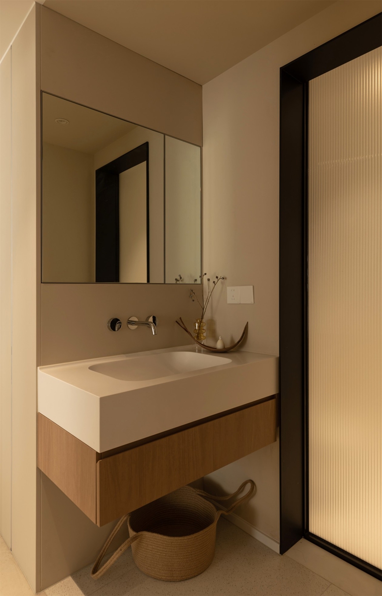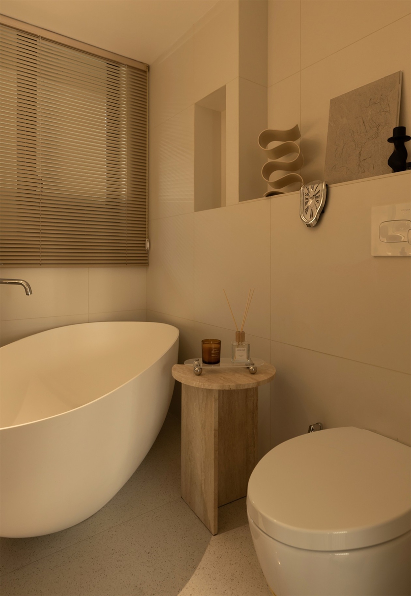 独立浴缸如一块被月光打磨的白玉,静候水与香氛的拥抱;木质小几托着香薰与烛火,让沐浴时刻成为一场私人疗愈仪式。墙面的艺术摆件与扭曲时钟,将“时间感”悄然解构——在这里,水流声是最好的背景音,每一次泡澡都是与自己的深度约会。