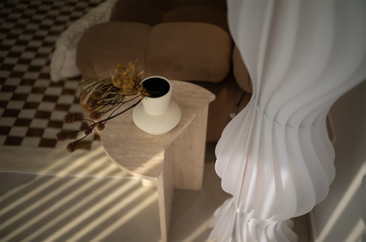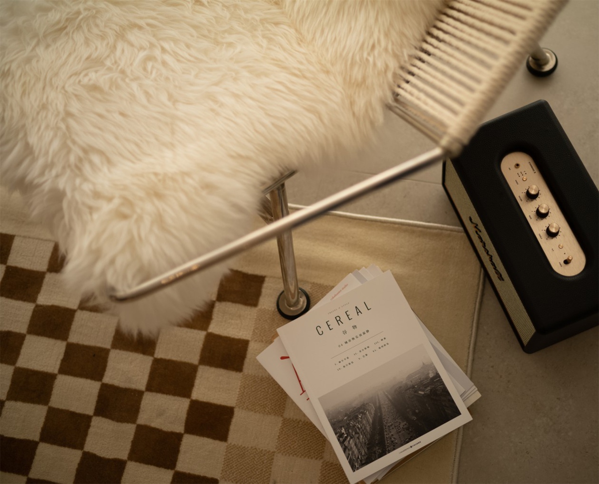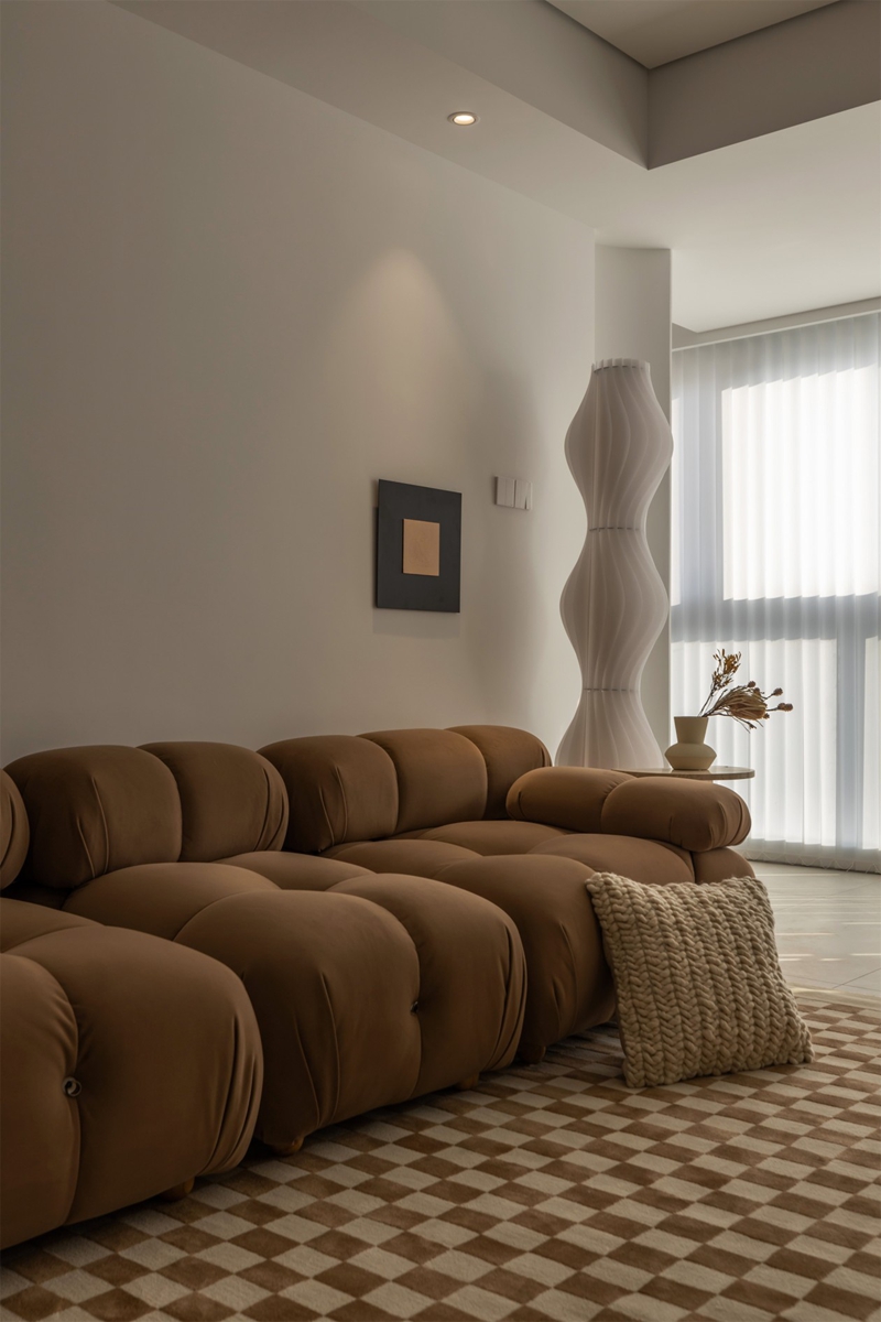 焦糖色模块沙发如被揉软的云朵,将身体温柔包裹;棋盘格地毯的复古纹路,在暖光里漾起岁月的涟漪。褶皱落地灯如抽象雕塑,让极简墙面生长出艺术呼吸感,而针织抱枕的粗粝触感,与沙发绒面形成温柔对话——在这里,每一寸肌理都在低语:“把匆忙日子,坐成慢慢的诗。”