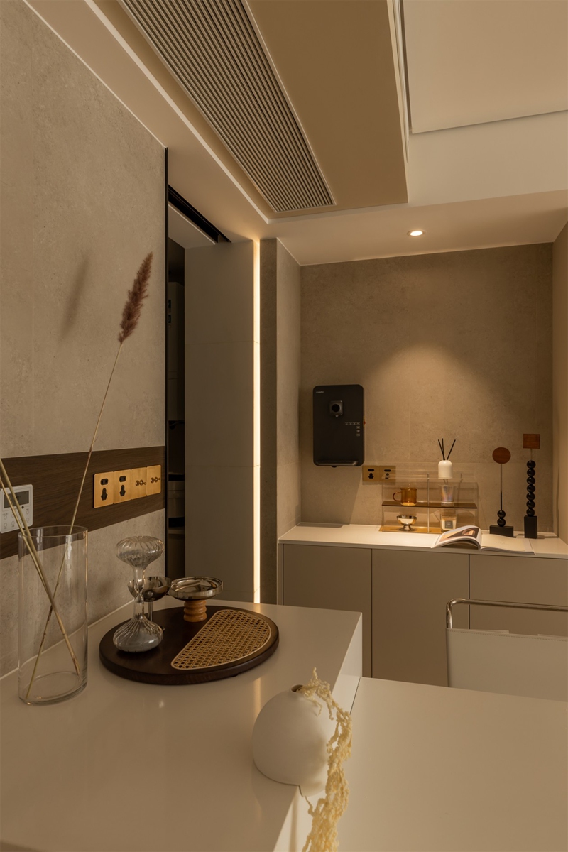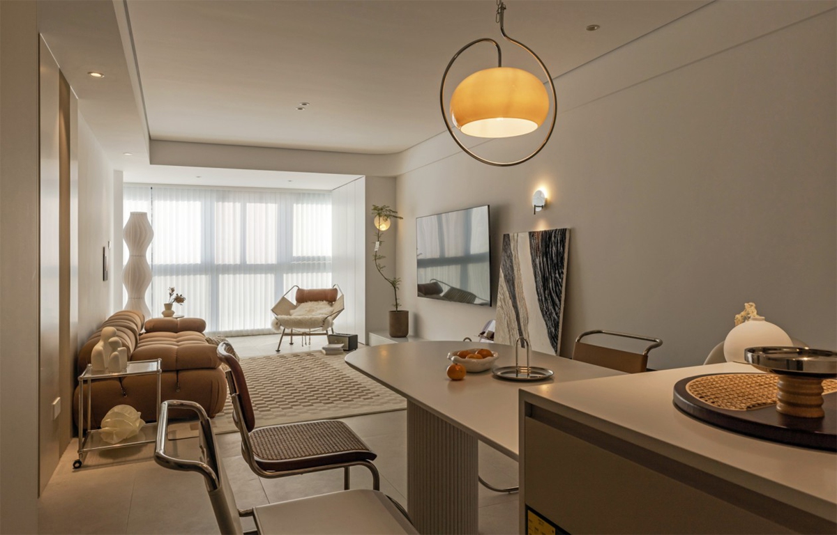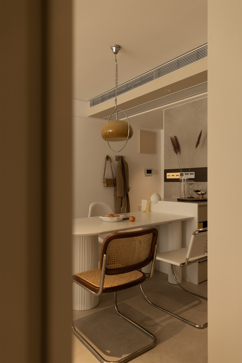 琥珀色吊灯如凝固的蜂蜜,在圆形餐桌上方晕染出暖调光晕;金属椅腿的冷冽线条,与藤编椅面的自然纹理碰撞出复古张力。门边悬挂的风衣与皮包,将“家的烟火”与“日常出行”悄然衔接,而台面的柑橘与干花,让餐厨空间既容得下烹饪的烟火,也盛得下晚风里的小酌时光。