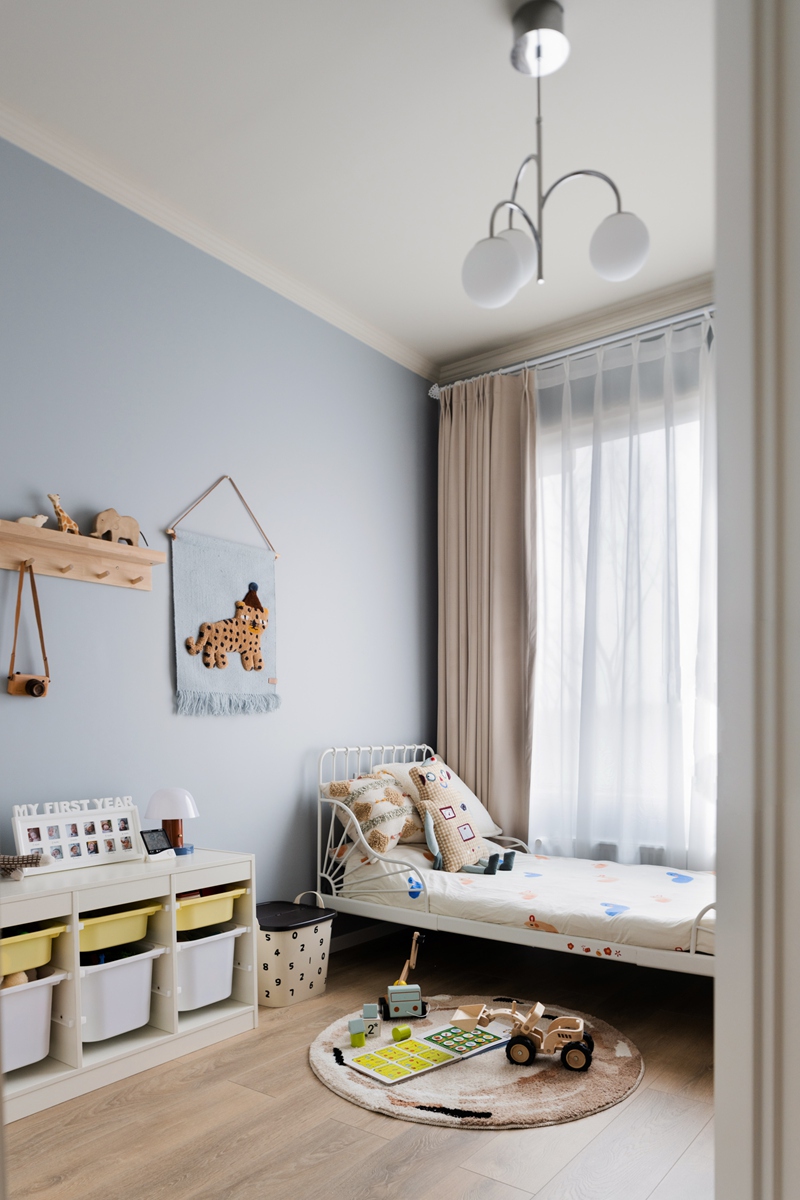 浅蓝色墙面晕染出梦幻底色,白色铁艺床支起童年的想象框架。机器人玩偶、卡通床品是孩子的玩伴,数字收纳箱悄悄培养秩序感,木质玩具与认知绘本铺就探索世界的第一步——这个空间没有多余装饰,却把“安全感”与“好奇心”装得满满当当。