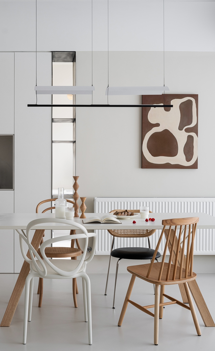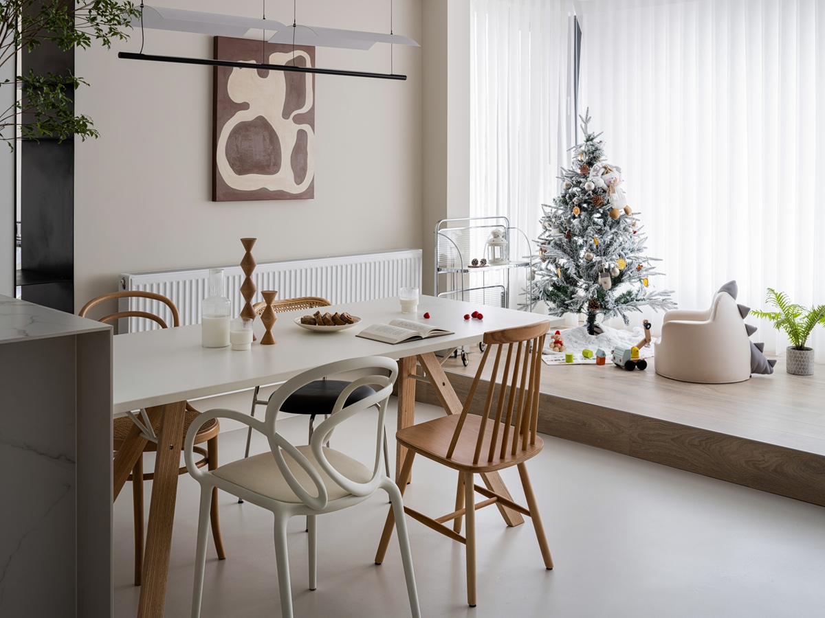 极简岛台既是大人备餐的操作台,也是孩子涂鸦的小天地。不同材质的餐椅包容全家的坐姿,圣诞树下的玩具车与餐边柜的艺术画相映成趣,将“烹饪的烟火”“节日的仪式”“亲子的陪伴”揉进同一空间,让每一次围坐都成为情感联结的契机。
