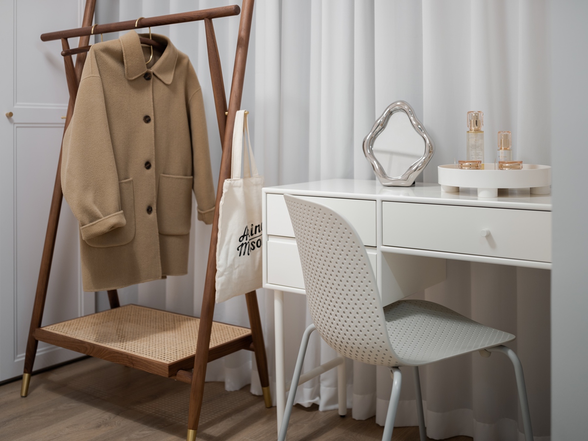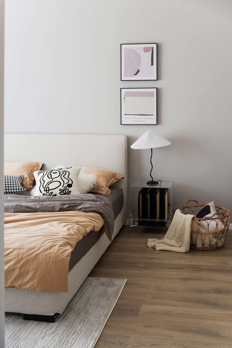 莫兰迪灰墙沉淀白日的疲惫,暖棕床品裹住深夜的松弛。透明边几、褶皱台灯的精致细节,与藤编篮的自然肌理共生,艺术挂画的抽象线条里,藏着只有大人能读懂的静谧。关上门,便是卸下“父母”身份、回归自我的疗愈场域。