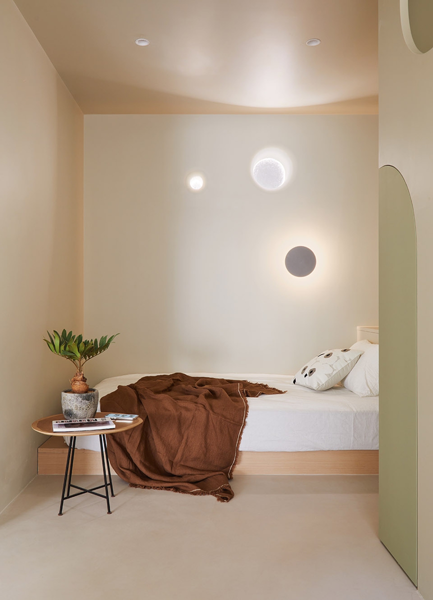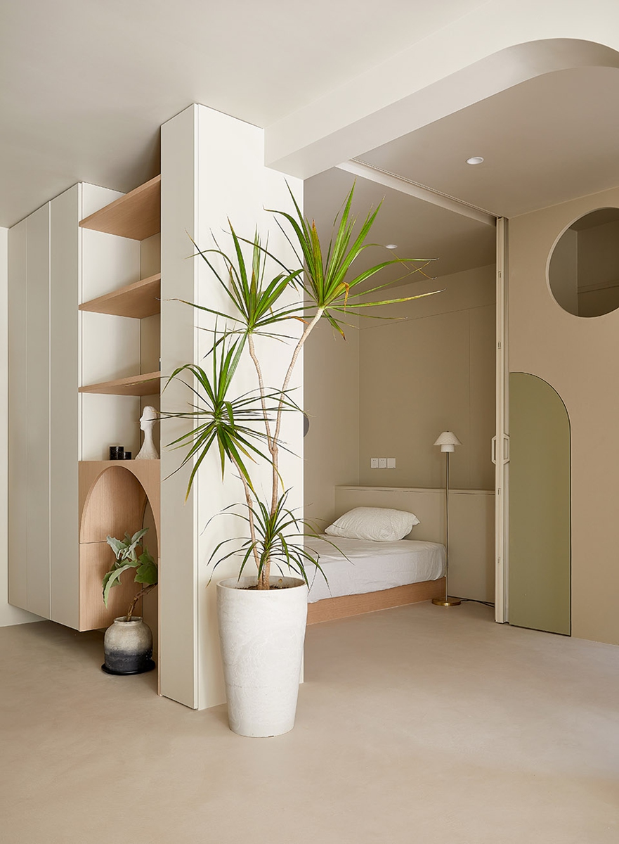 奶杏色墙面晕染出温柔基底,暖棕床品裹住深夜的松弛。原木小边几、弧面壁灯的细节里,藏着自然材质的温度;拱形门洞如时光的通道,将室外绿意悄悄引入,关上门,便是卸下疲惫、回归自我的疗愈场域——没有多余装饰,却用色彩与形态的温柔,把“睡眠的安稳”“独处的自在”都揉进每一寸空间。