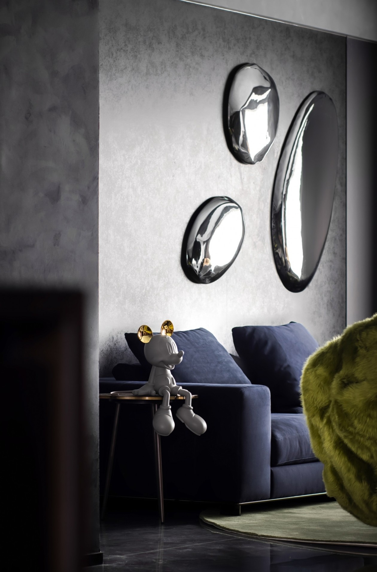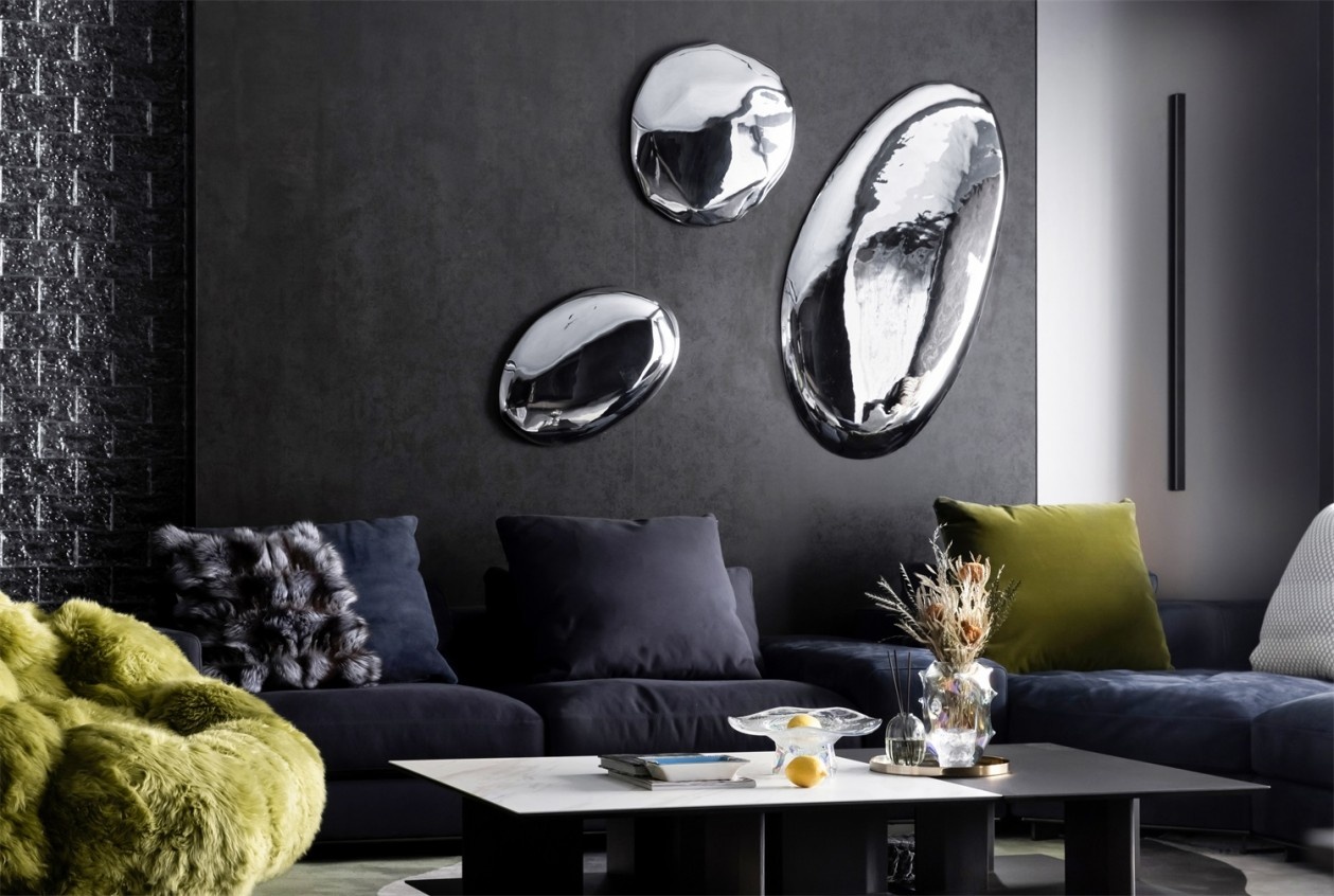 深灰与墨黑构建出沉稳的空间基底,如同高级定制的幕布,衬得那抹荧光绿的艺术感单椅格外夺目,成为视觉焦点的“惊喜炸弹”。绒面深蓝沙发的质感在光影下细腻流转,墙面金属感艺术装置如未来世界的镜面,折射出空间的多维层次。地面的反光石材与异形地毯形成材质对话,让每一次踏入都像走进沉浸式艺术展厅,奢华不再是浮夸的堆砌,而是藏在每一处材质、每一件陈设里的精致暗语。