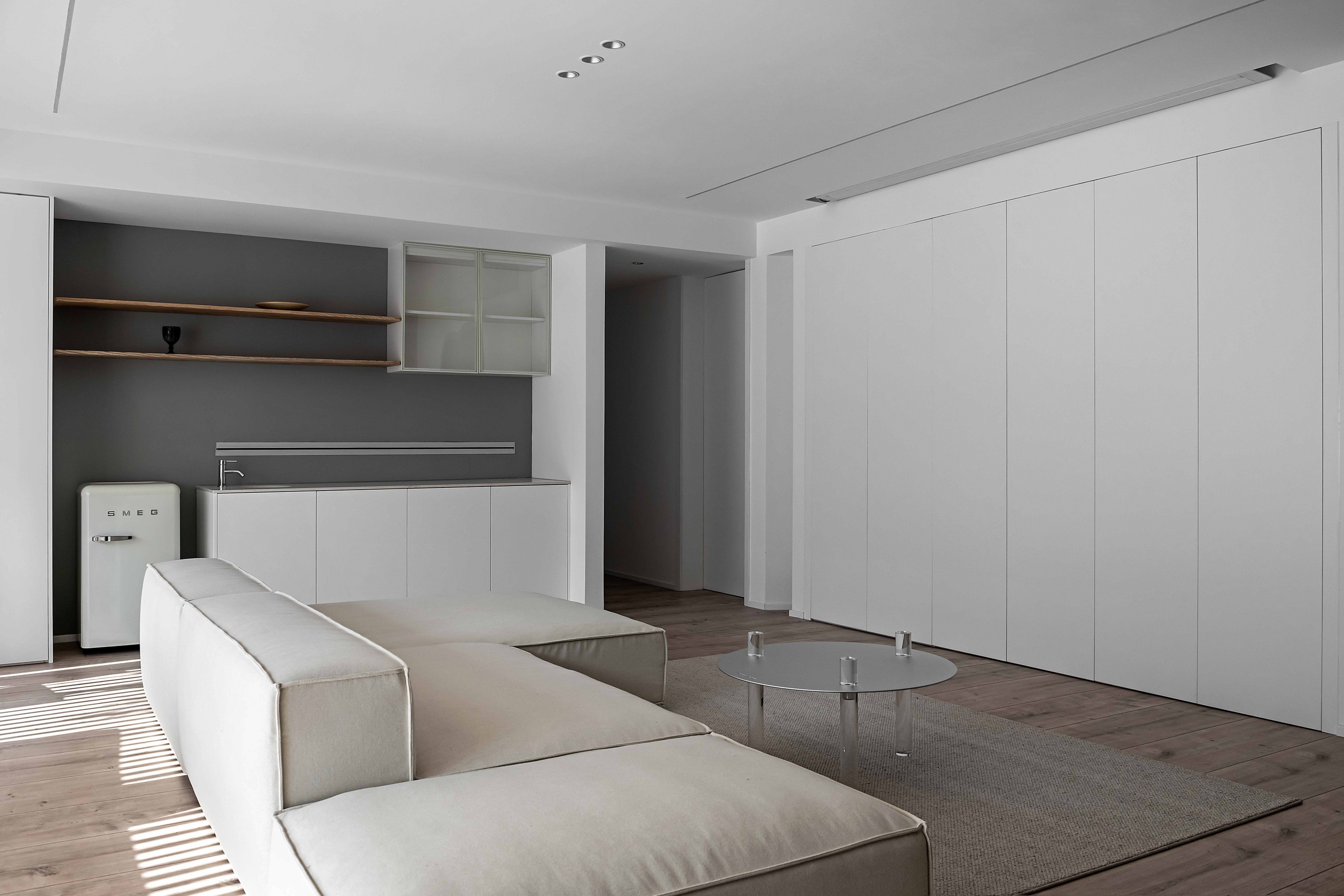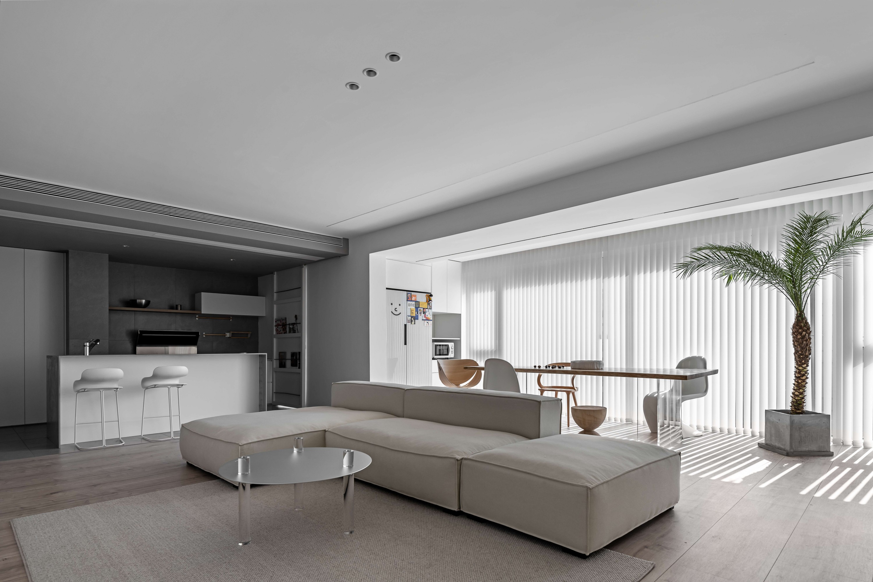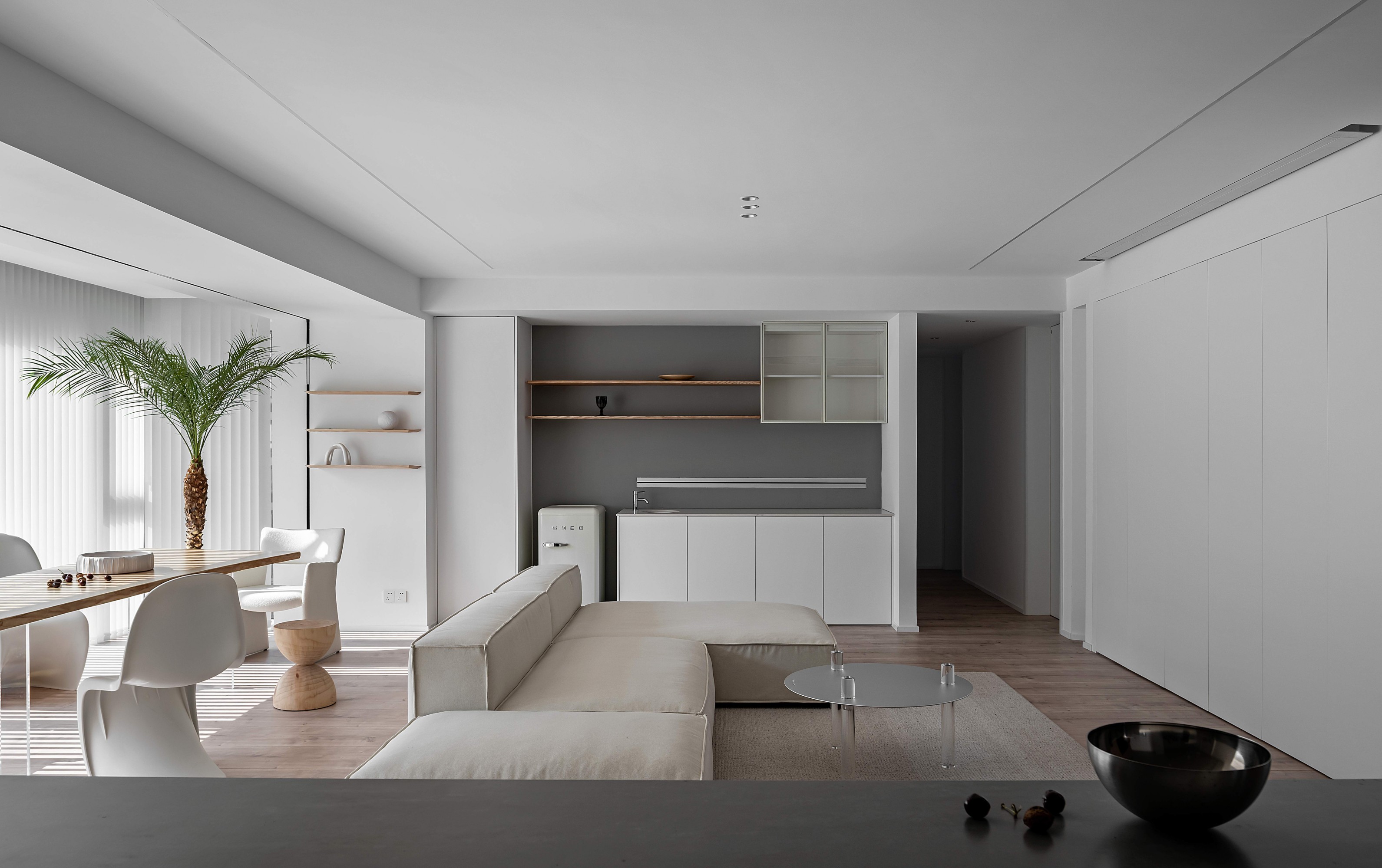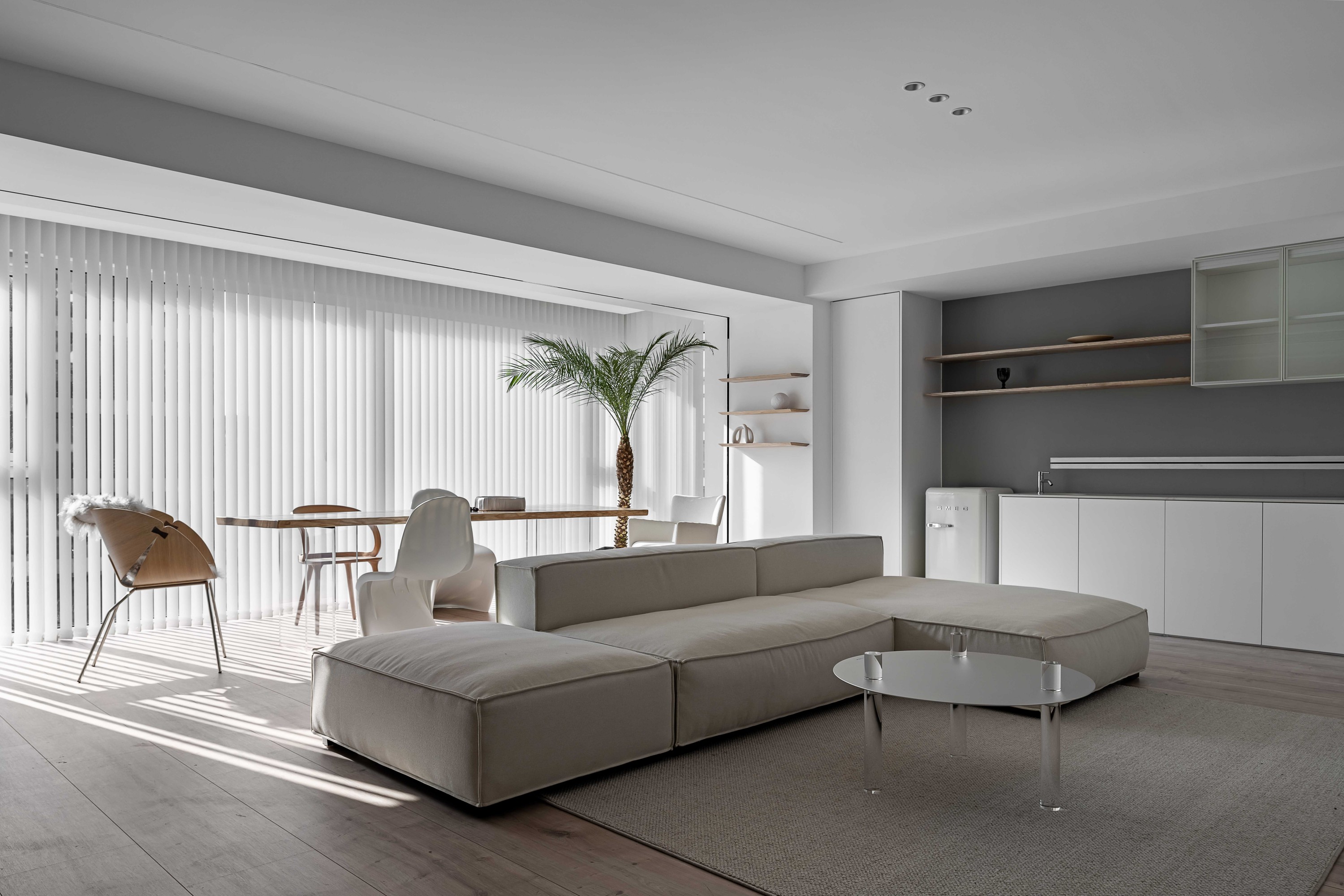 浅米色模块沙发如云朵般舒展,搭配透明质感的圆形茶几,在木质地板的温暖基调上,勾勒出松弛的会客场域。一侧的灰色餐厨区以复古SMEG冰箱点睛,木色层架与玻璃柜的组合,让收纳也成了艺术陈列;整面白色定制柜体则将琐碎隐于无形,在极简线条里,装下生活的从容。阳光透过百叶洒下,光影在空间里游移,每一处留白都是给生活的呼吸感。
