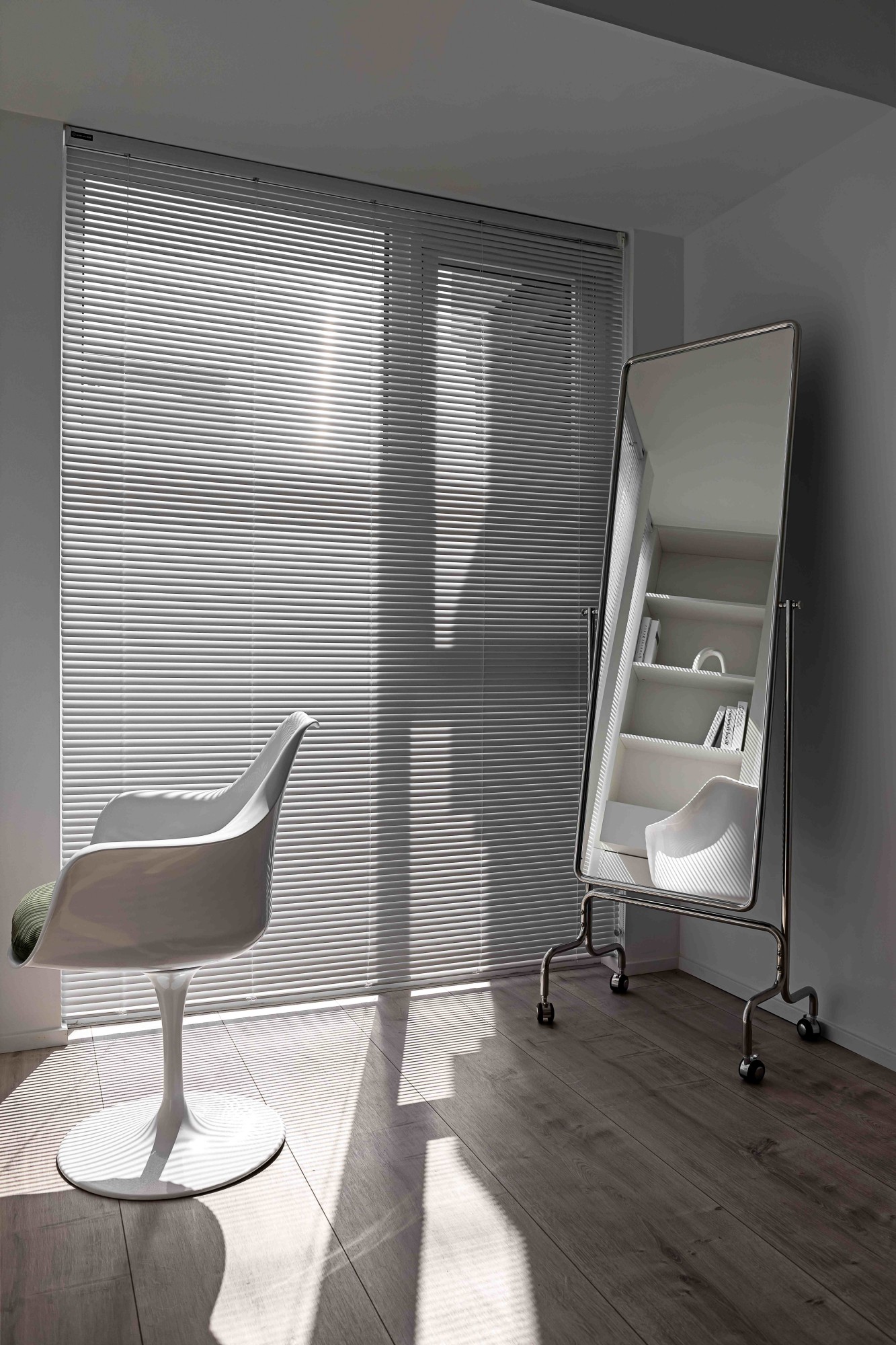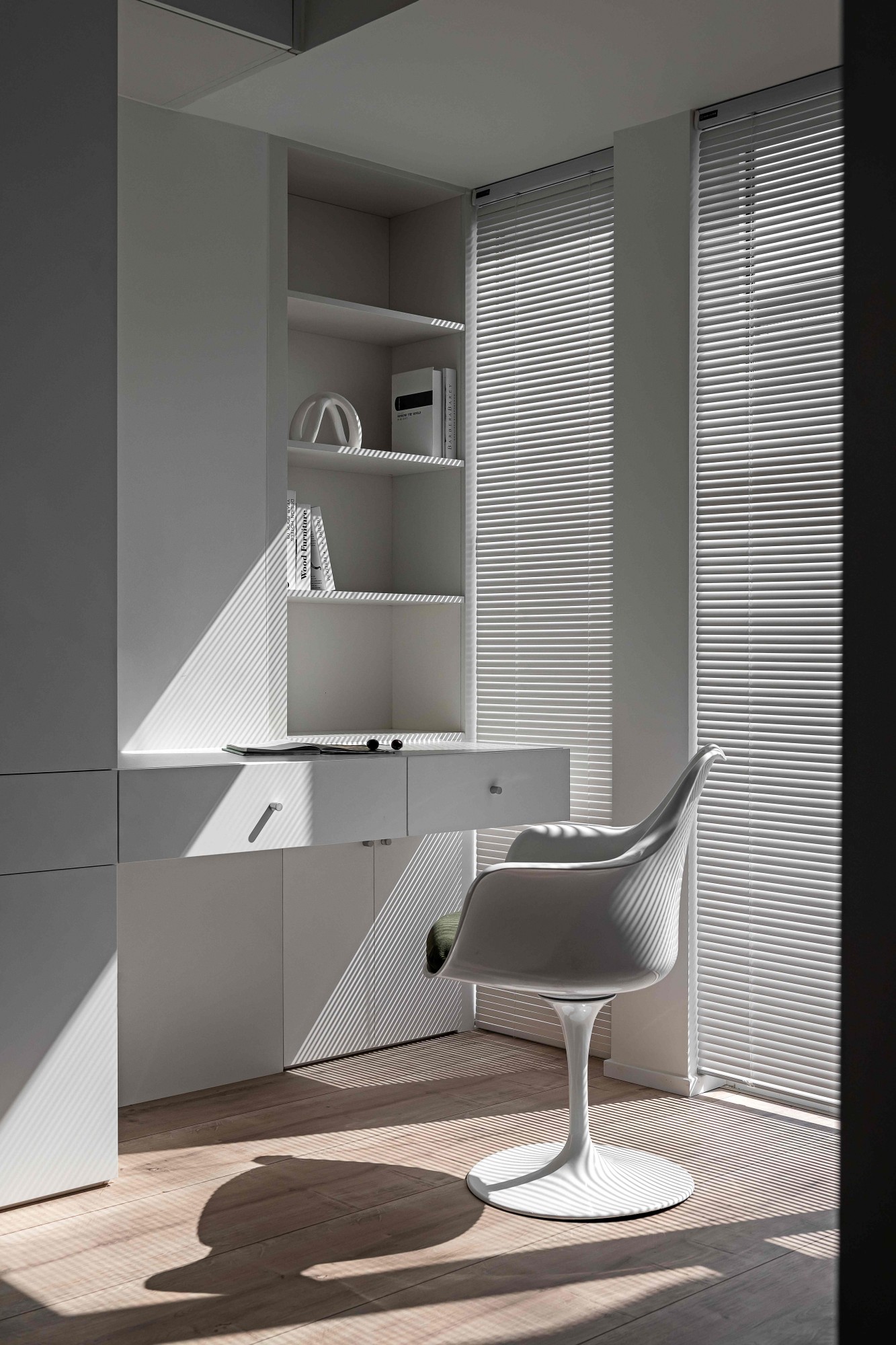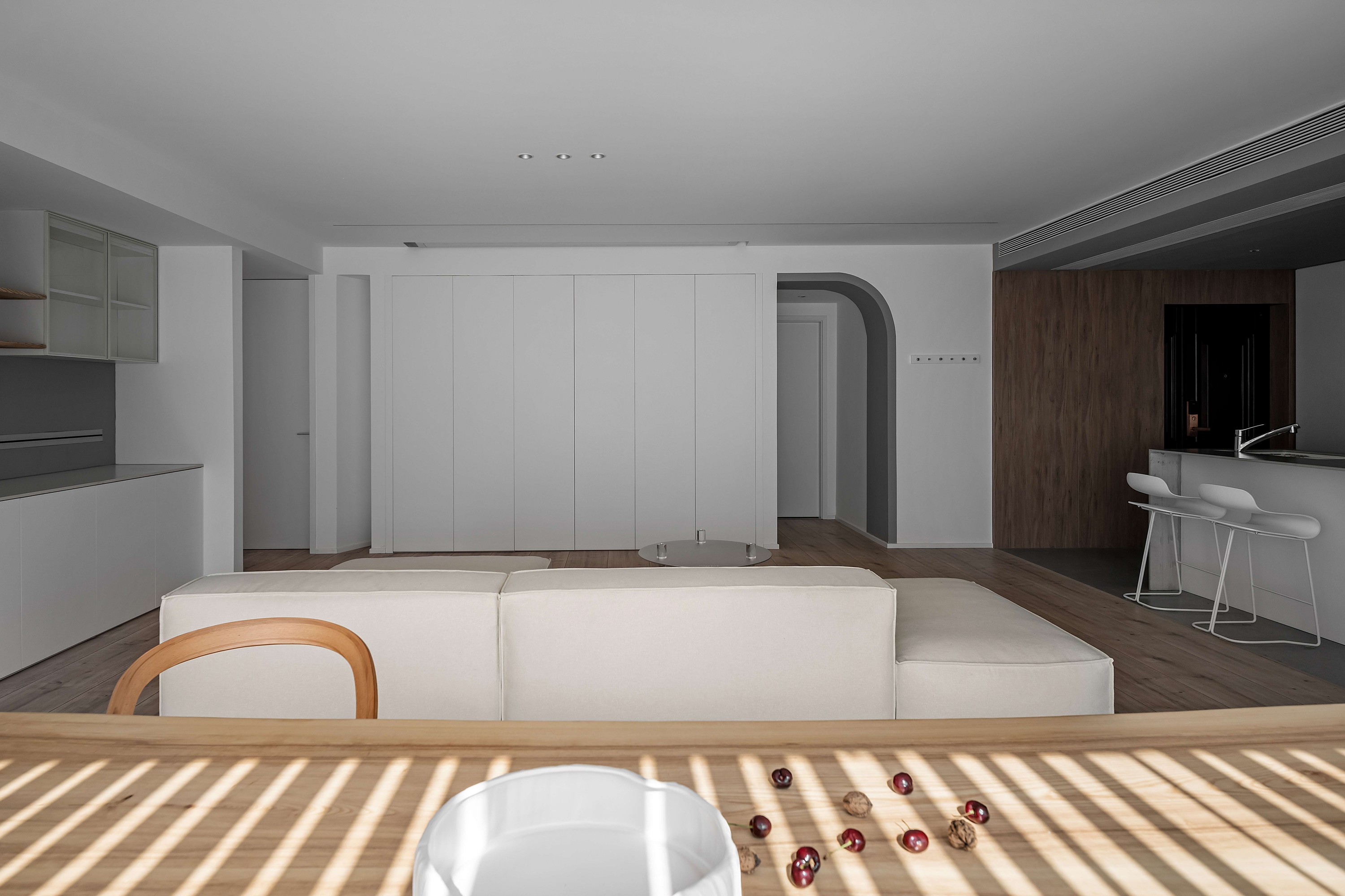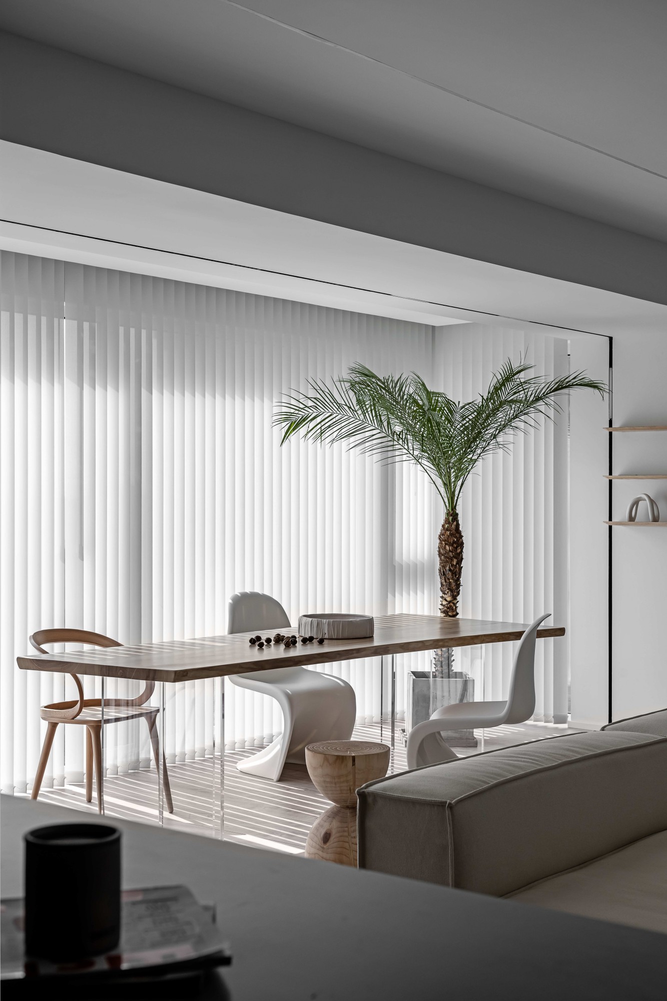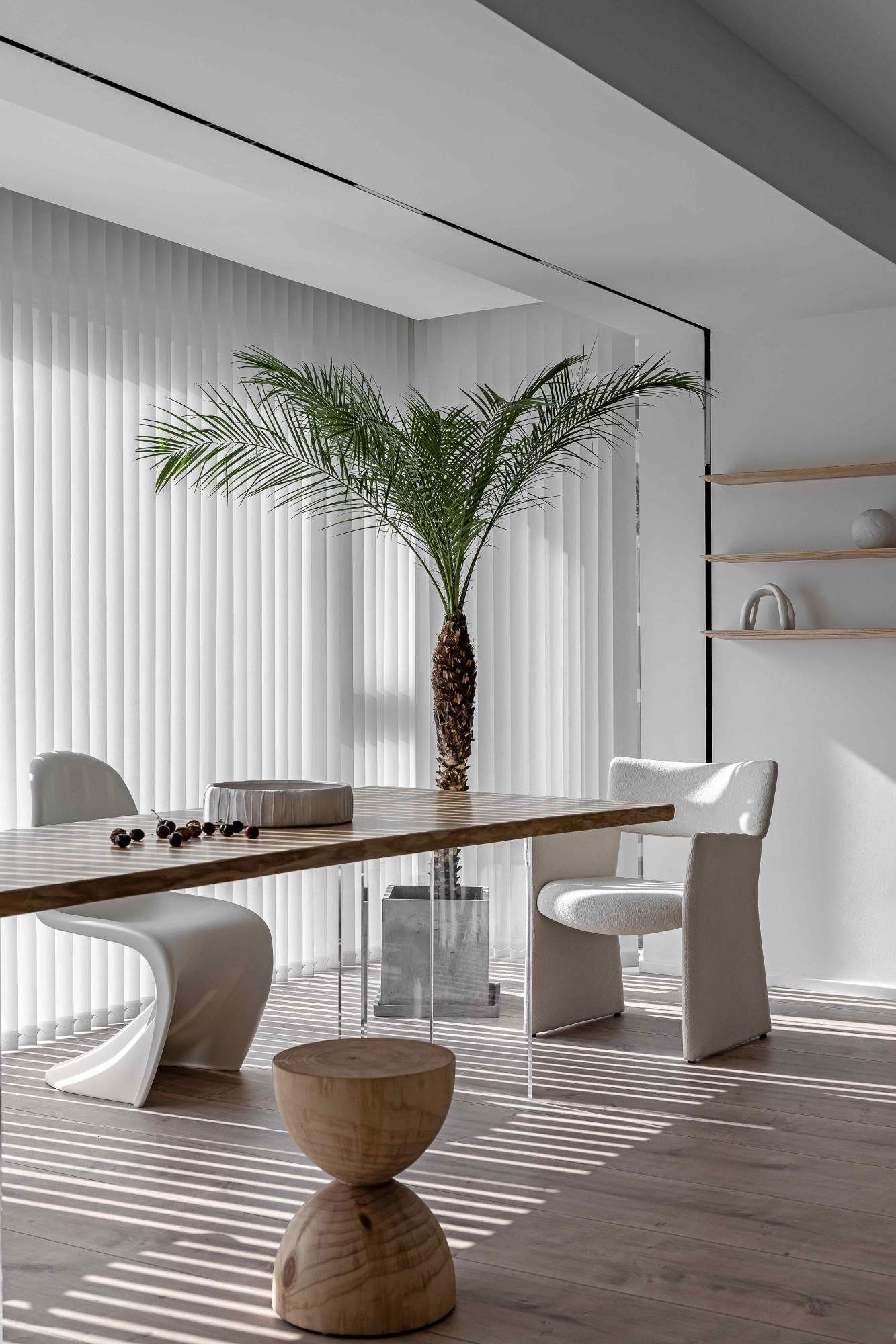 浅米色模块沙发如云朵般舒展,搭配透明质感的圆形茶几,在木质地板的温暖基调上,勾勒出松弛的会客场域。一侧的灰色餐厨区以复古SMEG冰箱点睛,木色层架与玻璃柜的组合,让收纳也成了艺术陈列;整面白色定制柜体则将琐碎隐于无形,在极简线条里,装下生活的从容。阳光透过百叶洒下,光影在空间里游移,每一处留白都是给生活的呼吸感。