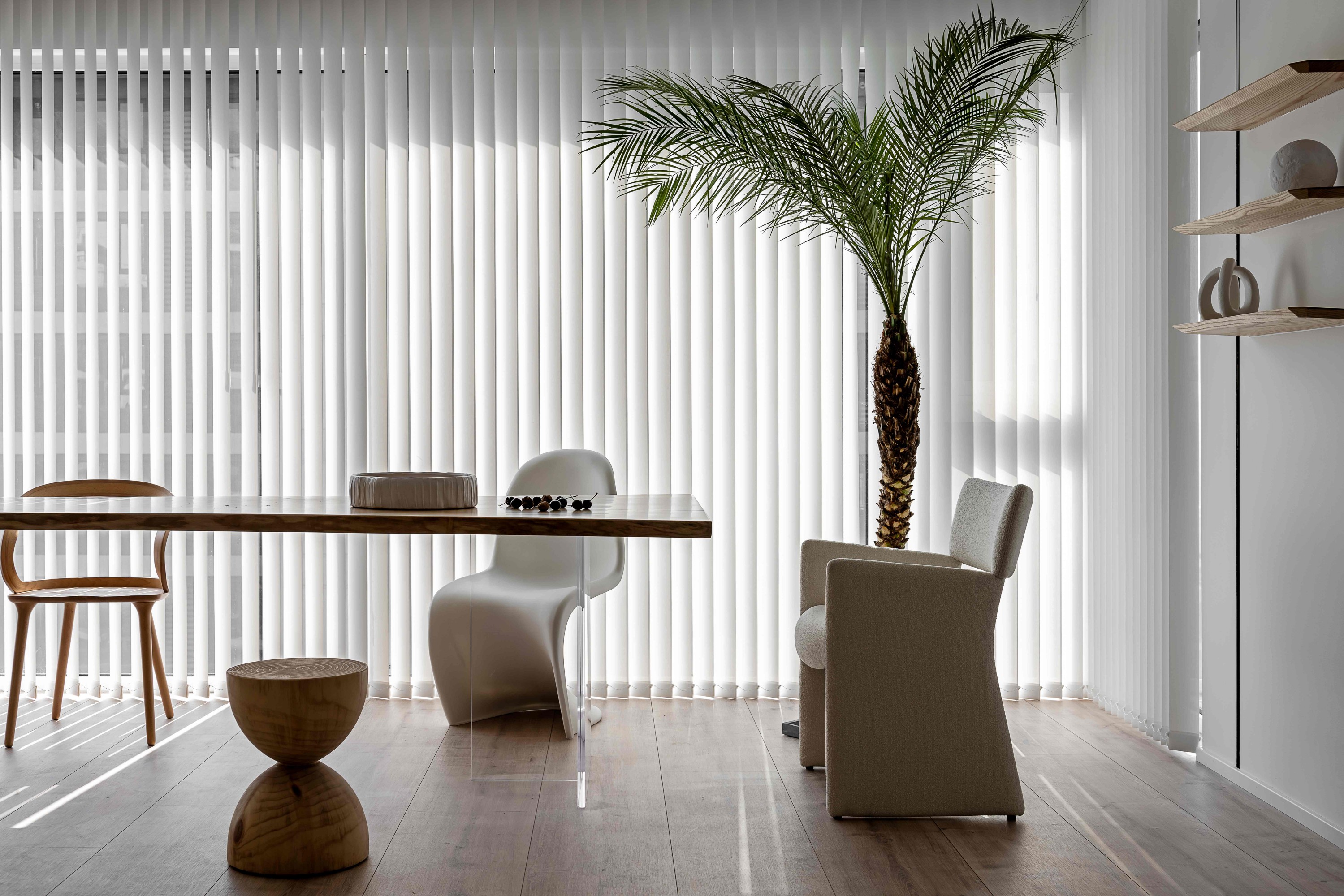 竖百叶帘滤过的光线,让餐厨区成了自然与艺术的共生地。实木餐桌质朴大气,搭配造型迥异的座椅——木质餐椅的温润、曲线单椅的灵动、布艺扶手椅的柔软,在碰撞中迸发个性。角落的高大绿植注入蓬勃生机,一旁的木色层架陈列着艺术摆件,每一次用餐,都是一场沉浸式的美学体验。