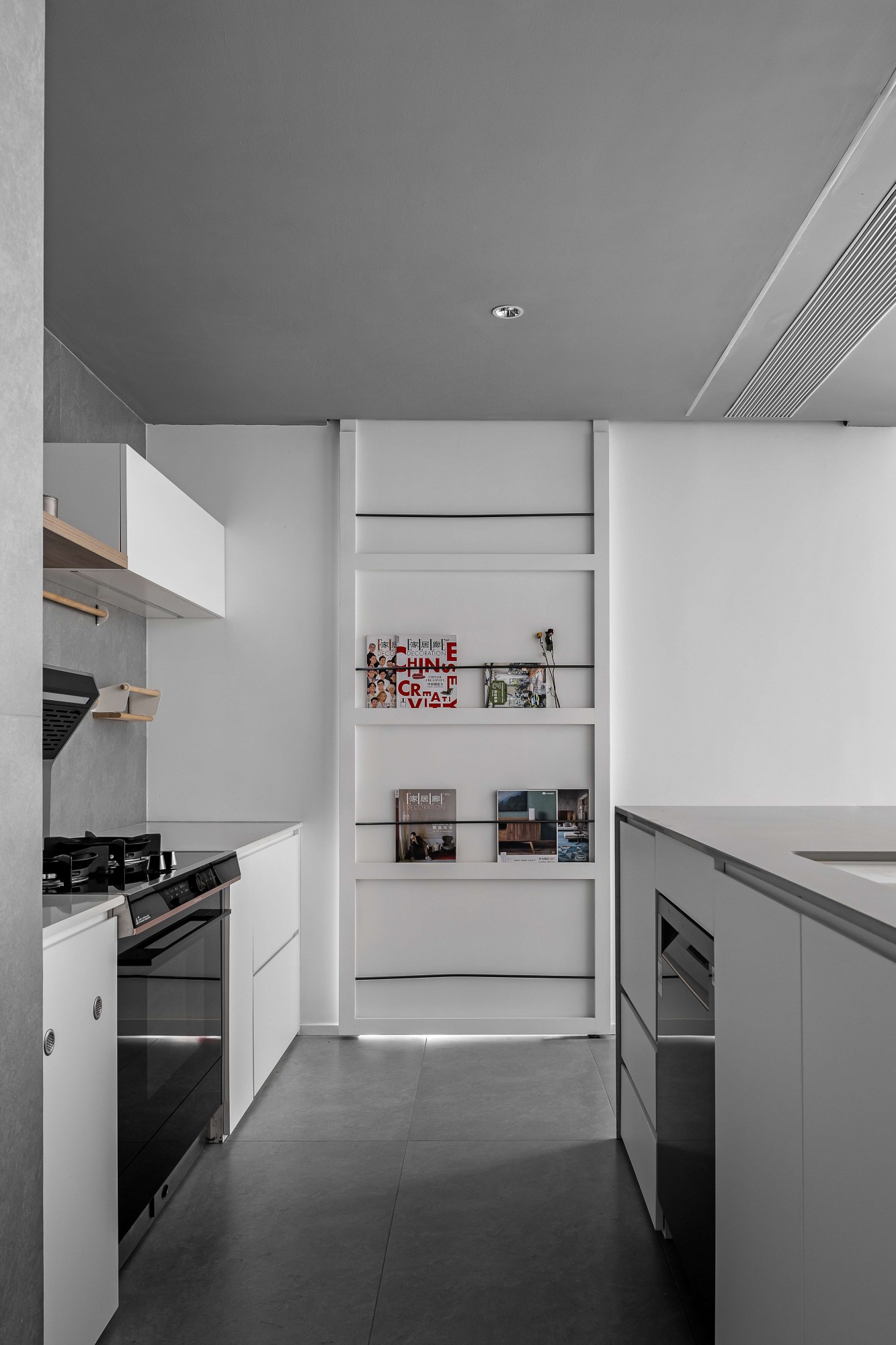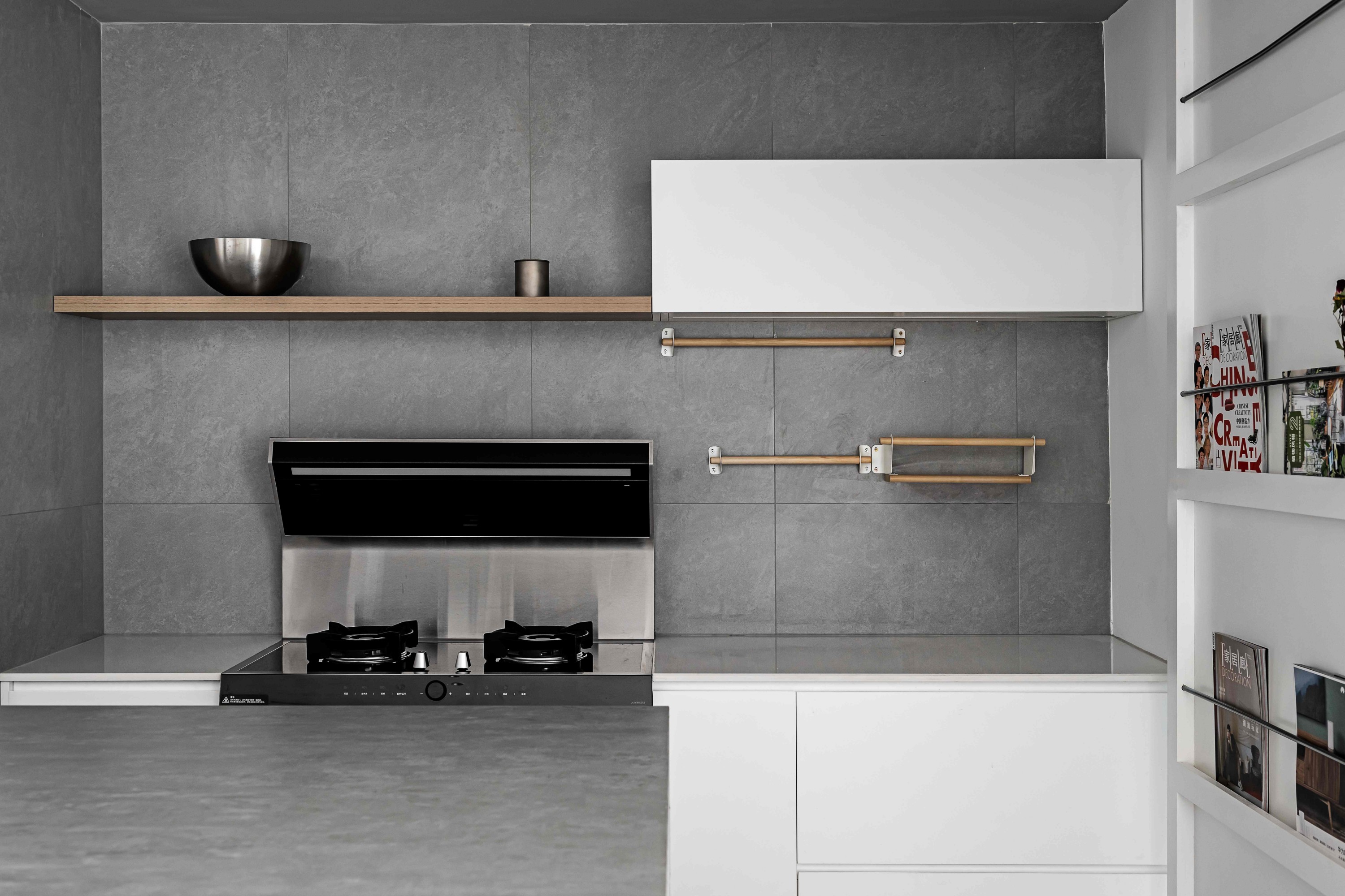 灰色调厨房以岛台为核心,白色吧台椅的轻盈线条,中和了灰色墙面与地面的沉稳。开放式收纳架上的杂志与小物,为理性空间注入生活温度;金属厨具与木色层架的搭配,让烹饪的烟火气也有了精致质感,在这里,下厨不再是任务,而是一场关于生活的创作。