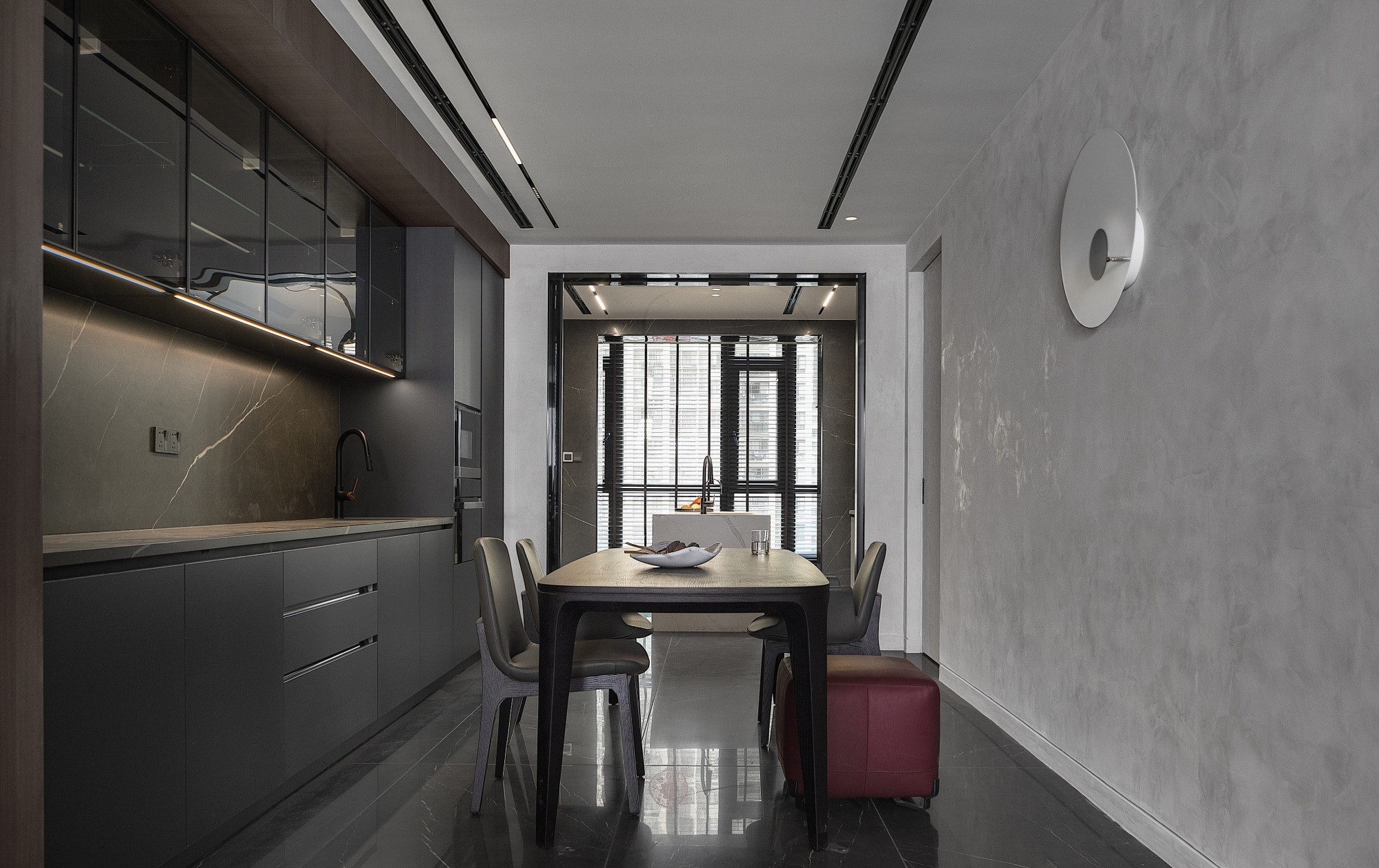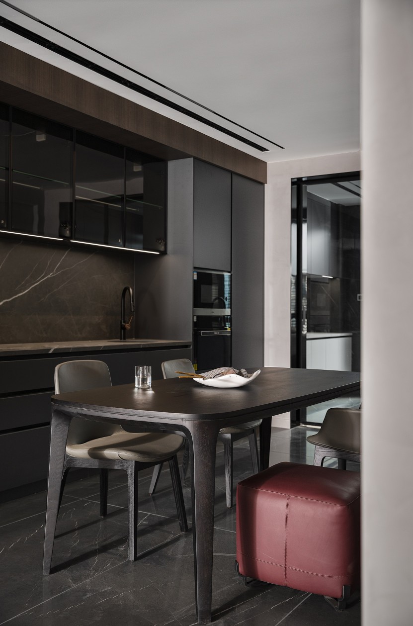深灰橱柜与大理石纹理的碰撞,是理性与美学的共生。玻璃吊柜的通透感消解了空间压抑,极简餐桌搭配哑光餐椅,一抹酒红矮凳成为视觉跳色。开放式布局让烹饪、用餐与社交自然衔接,在利落线条与暗藏灯带的烘托下,烟火气也变得极具设计感。