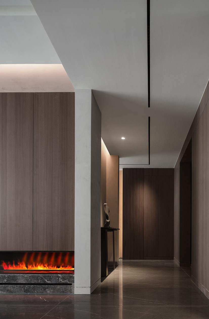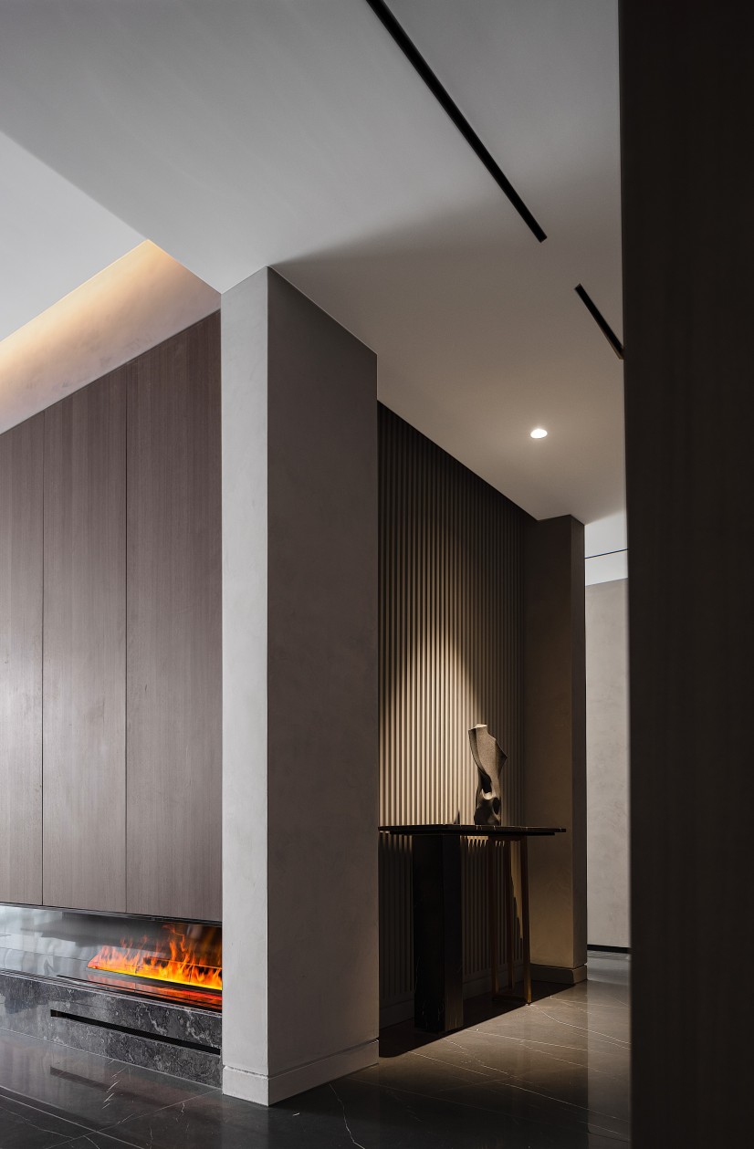 微水泥墙面的细腻肌理,与烟熏木饰面的温润质感交织,勾勒出冷静又奢华的空间调性。浅灰真皮L型沙发以慵懒姿态拥抱生活,圆形金属茶几的厚重与壁炉的跃动火焰形成张力,在无主灯设计的光影层次里,每一处细节都在诉说当代精英的品位独白。