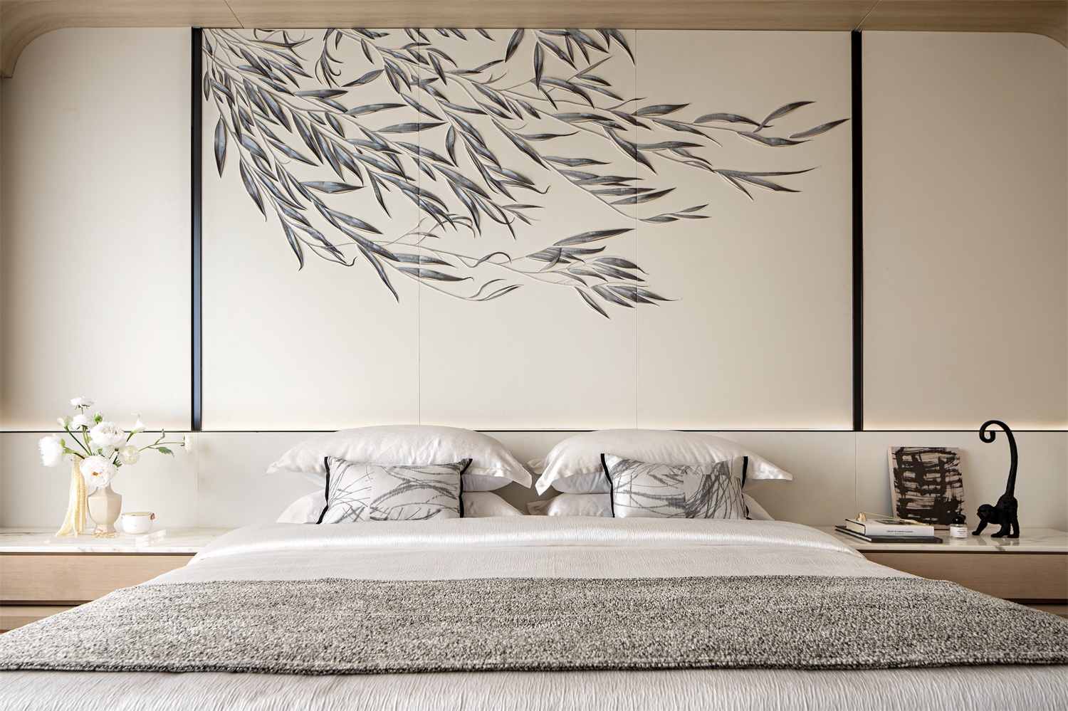 弧形木饰面打造的穹顶结构,如温柔的茧包裹住整个睡眠空间。浅木色的自然肌理与纯白床品呼应,背景墙的枝叶艺术画为空间注入禅意,在纱帘与木地板的柔化下,每一次躺卧都是对都市疲惫的温柔消解,是物质与精神的双重栖居地。