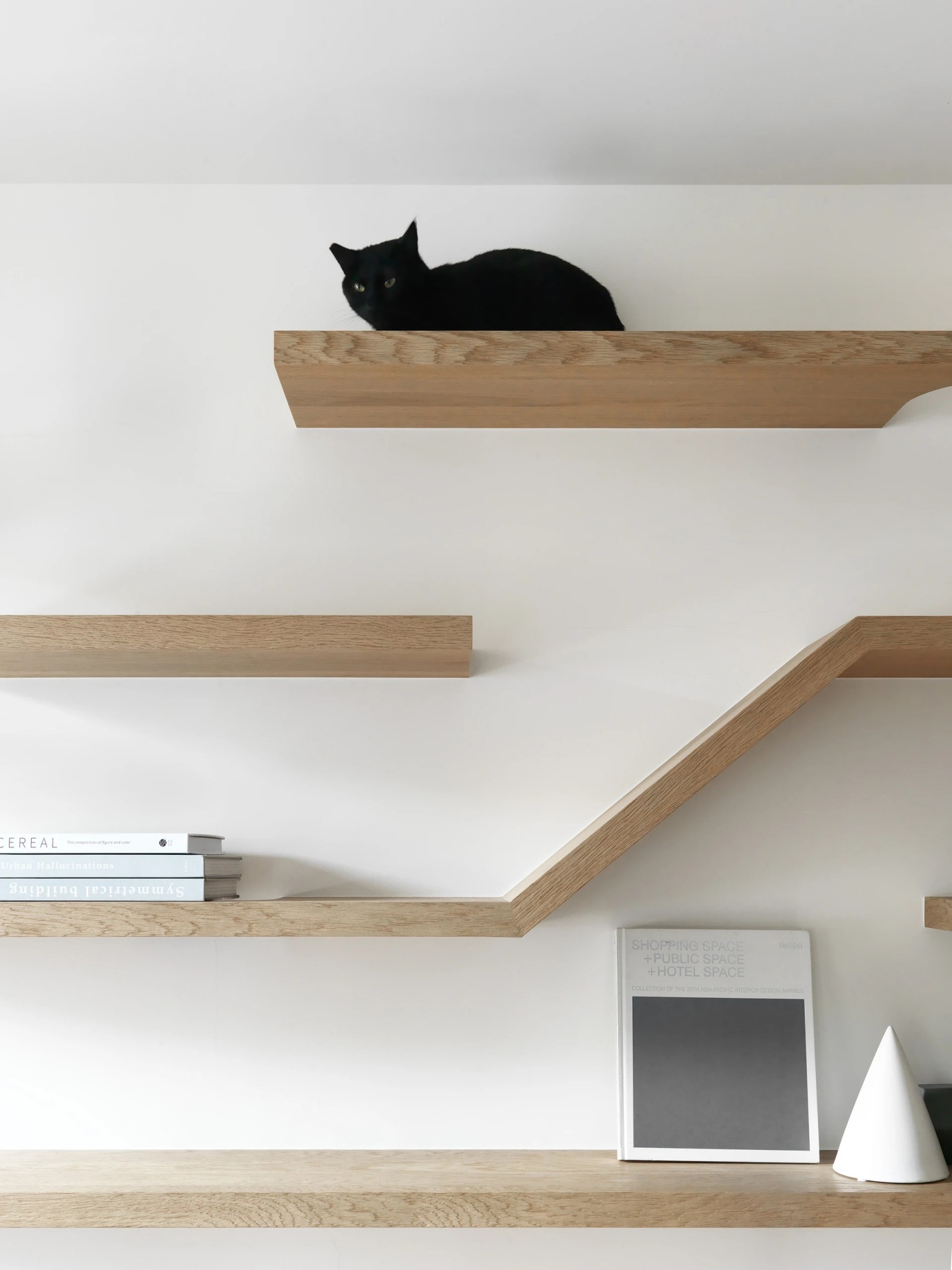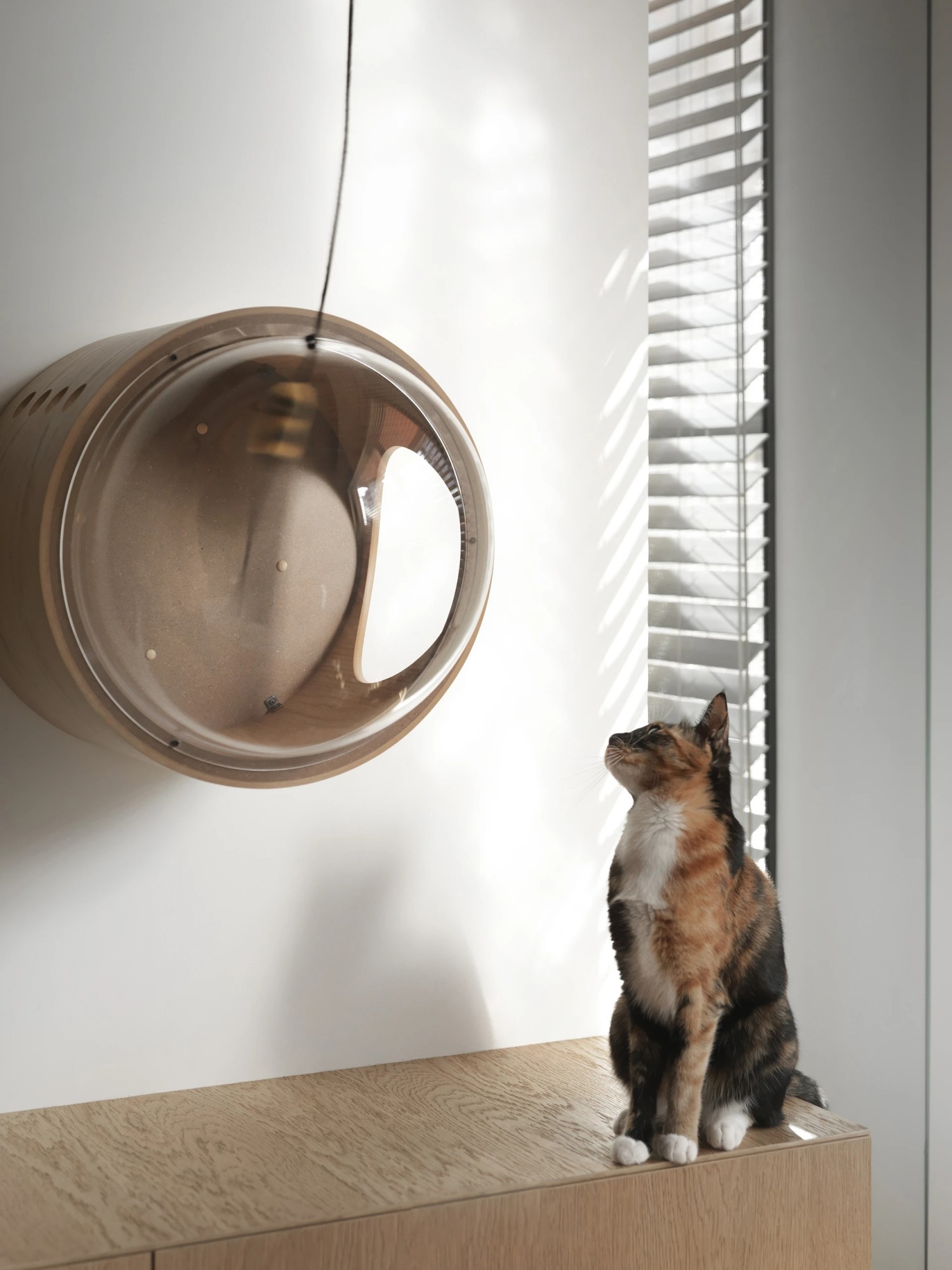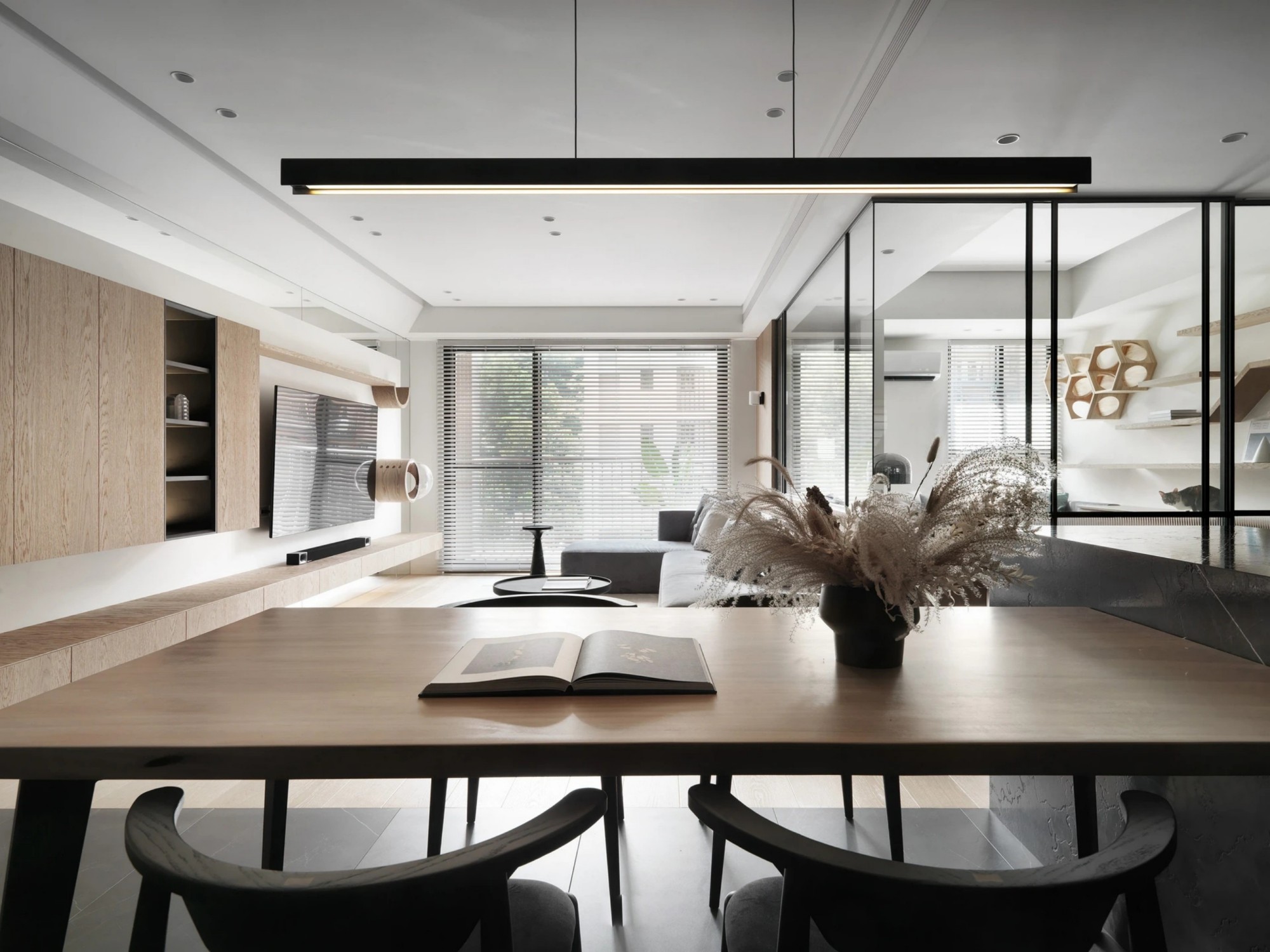 浅木色的柜体与地板勾勒出空间的温润底色,灰色L型沙发以慵懒姿态容纳生活的松弛时刻。无主灯设计让光线如呼吸般自然散落,玻璃隔断模糊了空间边界,却让通透感倍增。在这里,每一处线条都极简利落,每一抹色彩都克制内敛,猫咪的原木游乐区更添生活意趣,让简约空间漾起温暖涟漪。