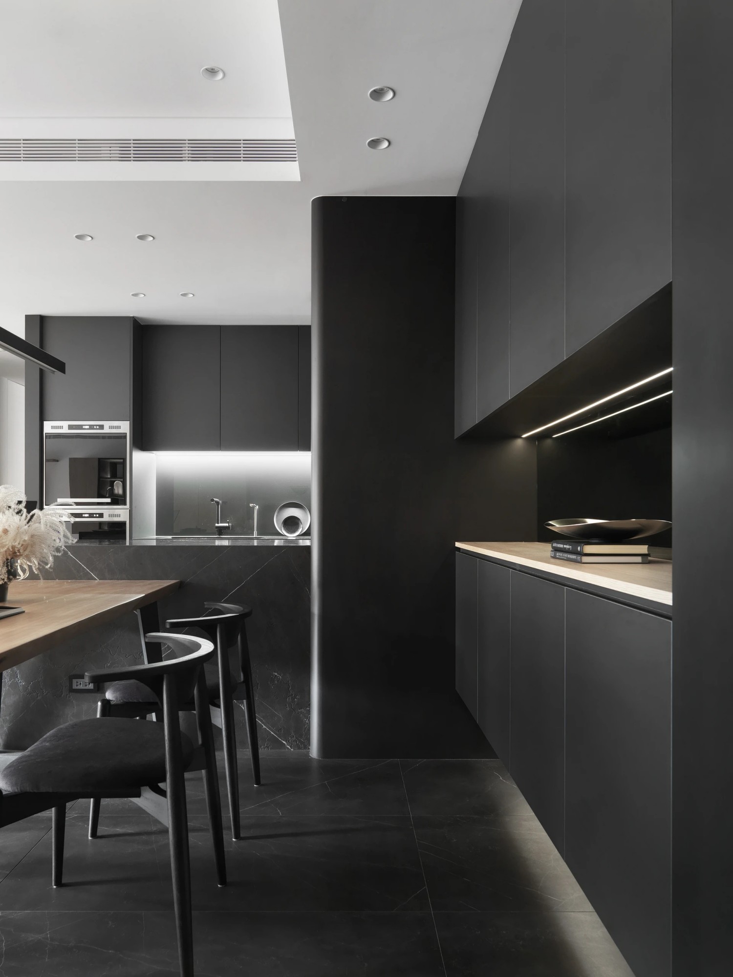 当深黑橱柜邂逅浅木餐桌,一场关于质感的对话就此展开。极简长吊灯如艺术装置般悬于餐厨上空,为料理与用餐时刻镀上精致光晕。一体化设计的厨房将功能与美学完美糅合,黑色石材的冷峻与木质的温暖碰撞出摩登烟火气,每一次烹饪、每一次举杯,都是对当代生活美学的优雅诠释。