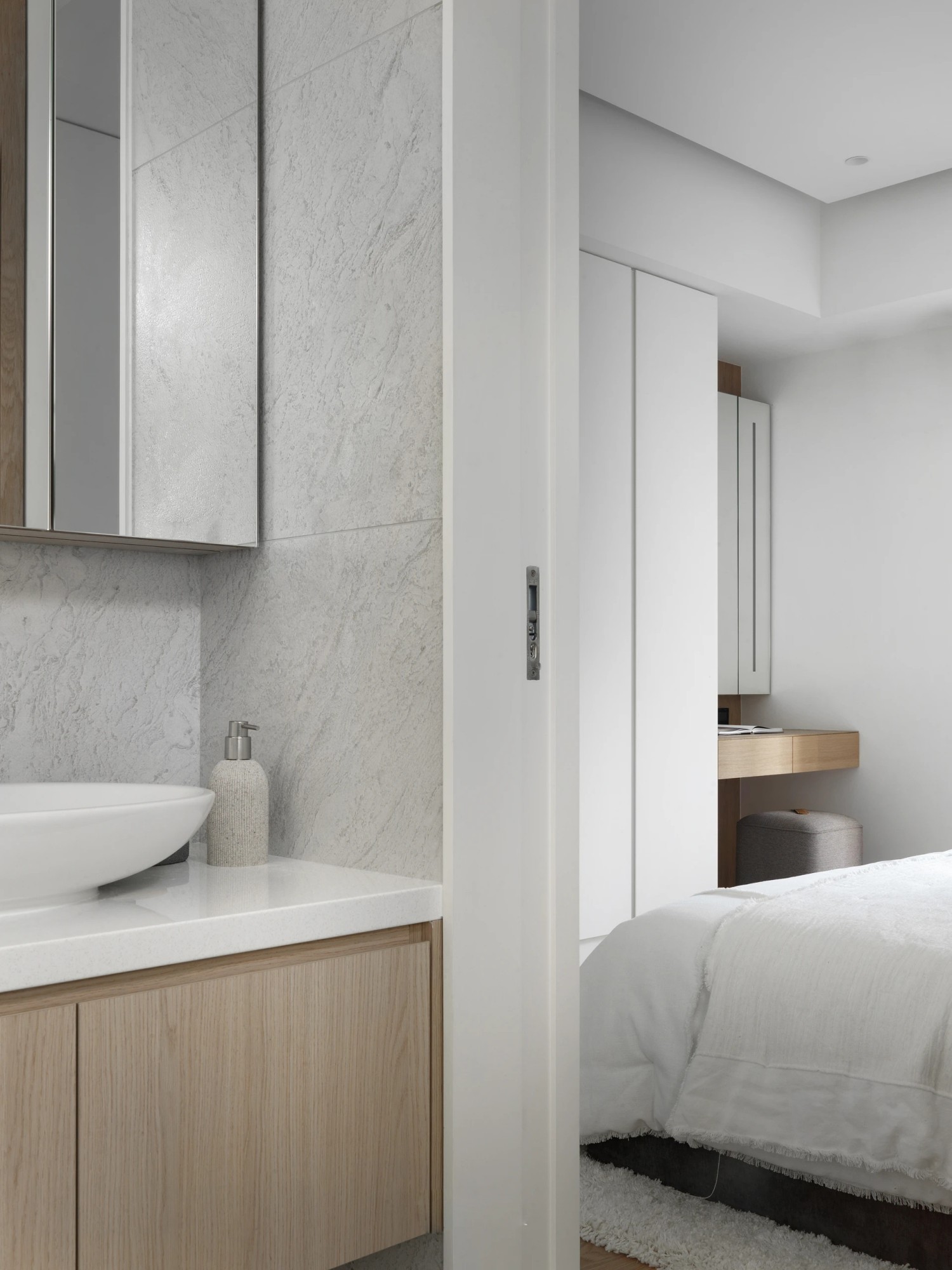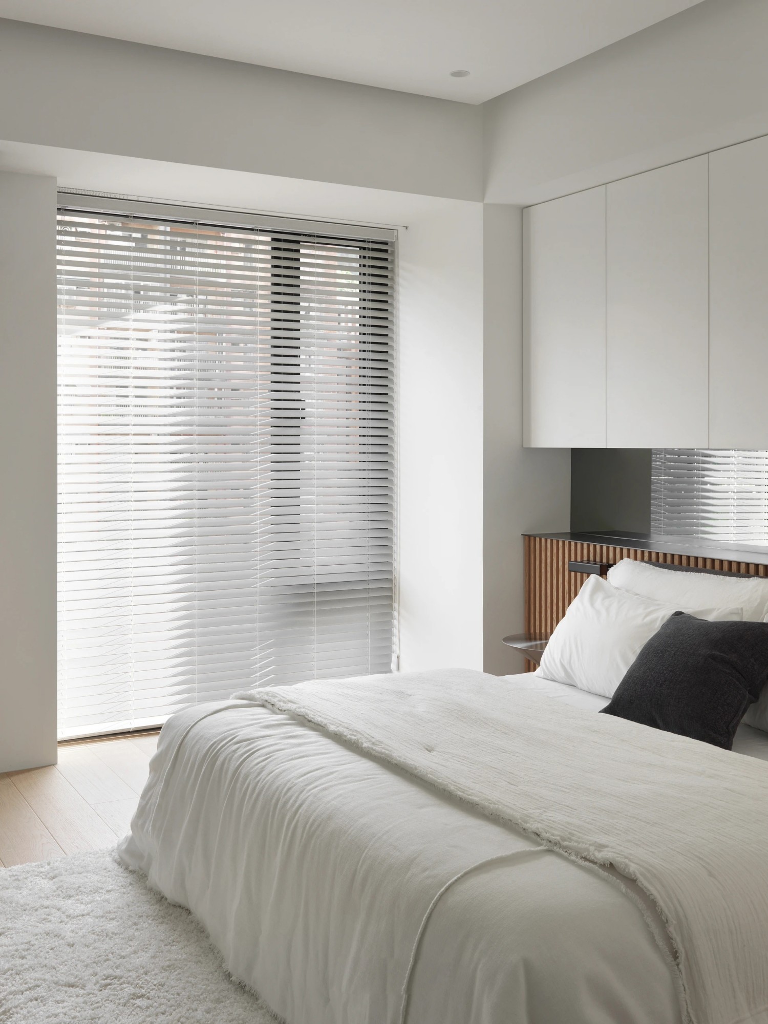 纯白基调铺就一方静谧天地,百叶窗滤过的光线温柔地洒在松软床品上。极简柜体隐于墙面,木质元素在床头悄然点睛,删繁就简的设计语言,为身心打造出毫无负担的休憩港湾。在这里,睡眠是一场与纯粹的对话,每一寸空间都在诉说“少即是多”的生活哲学。
