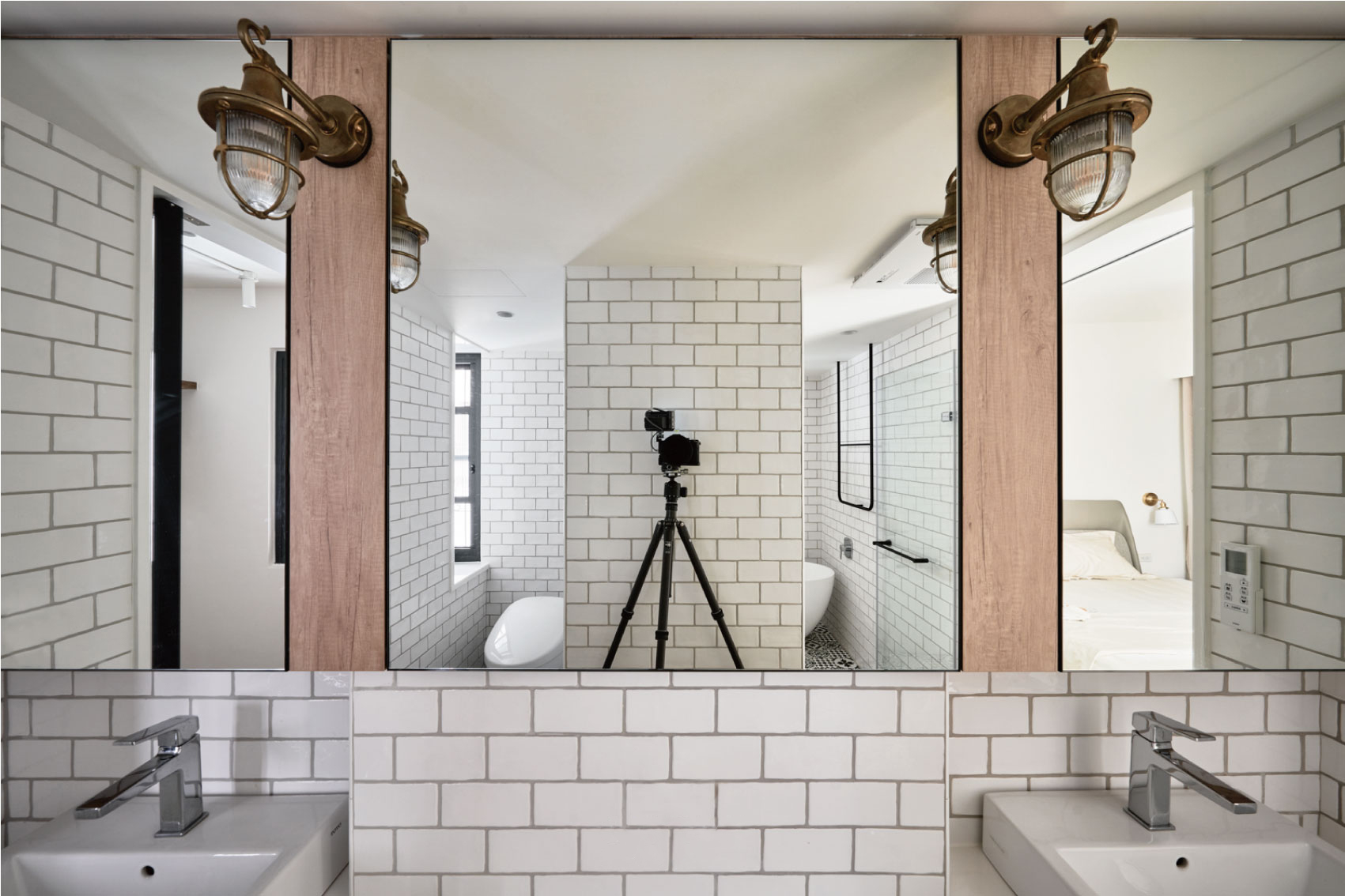 黑白花砖地面是整个空间的“复古主角”,搭配白砖墙面,热闹却不杂乱;双台盆+木质置物架,把“复古颜值”和“日常实用”绑在了一起;黄铜壁灯和厨房的吊灯呼应,连长虹玻璃门都和卧室统一,整个家的风格像“串起来的珍珠”,每一处都有呼应。