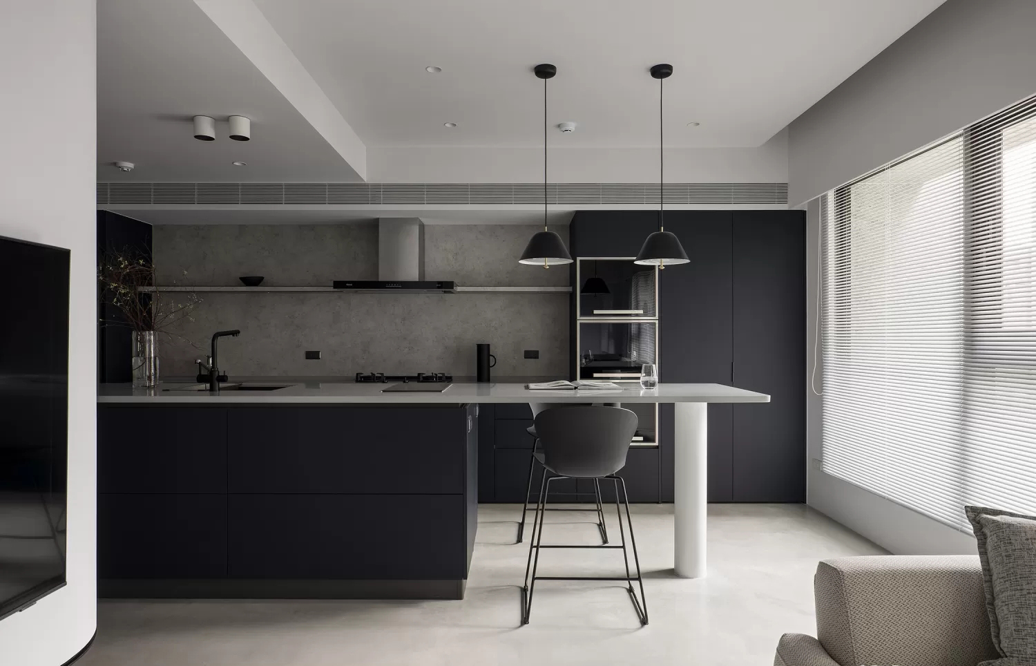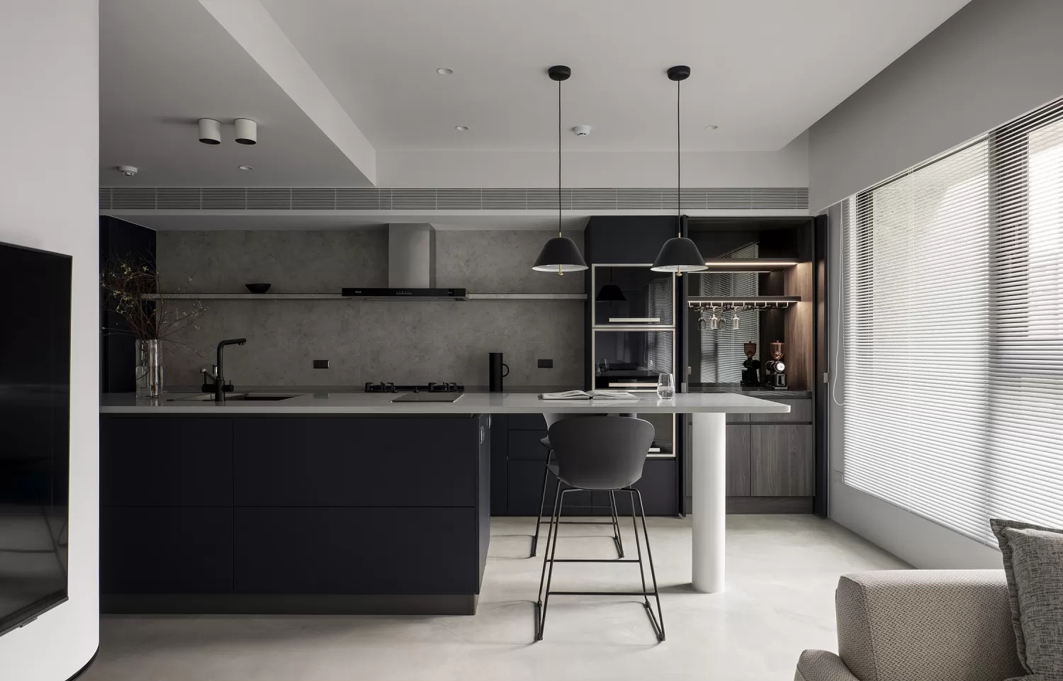 • 隐藏式储物很聪明:深黑柜门将电器、杂物藏起,中间留玻璃展示格,既保持极简调性,又能露出精致小物。