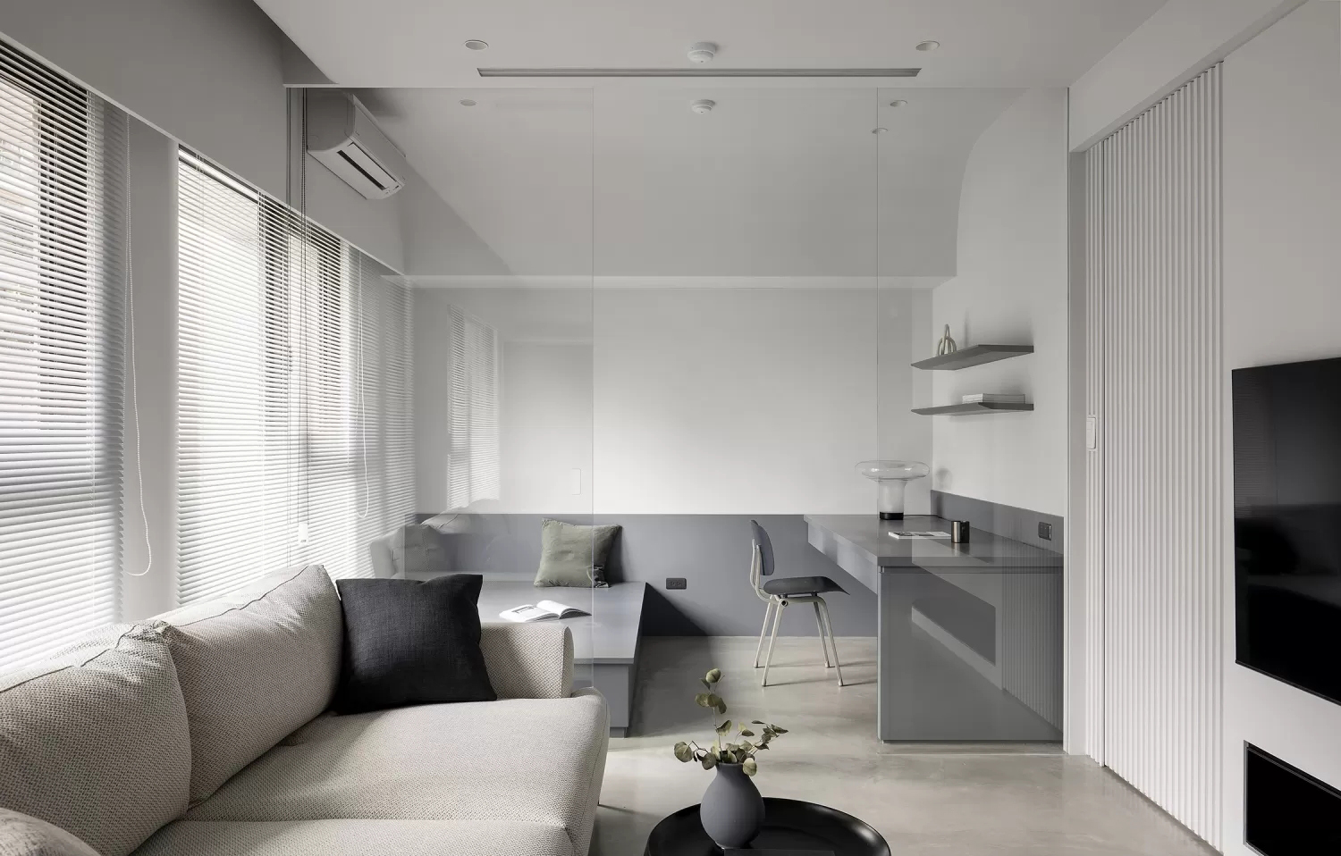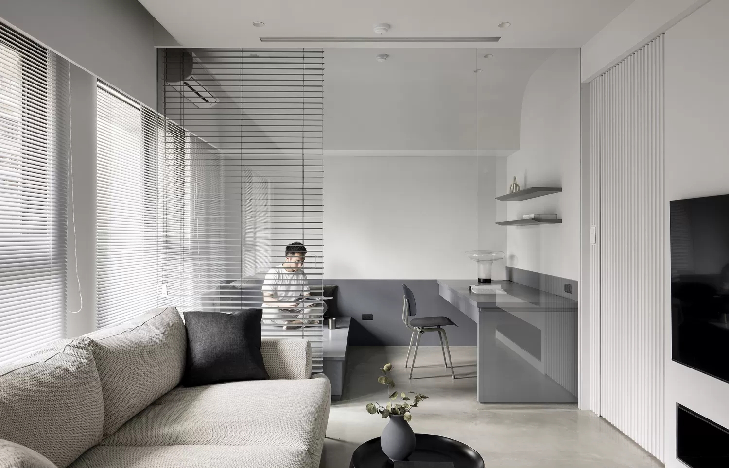 • 用百叶玻璃墙划分客厅与书房:百叶既能遮挡隐私,又不会完全隔断光线,让两个空间保持通透联动;书房做悬浮式书桌+极简层板,没有多余装饰,把“极简”落到实用里。
