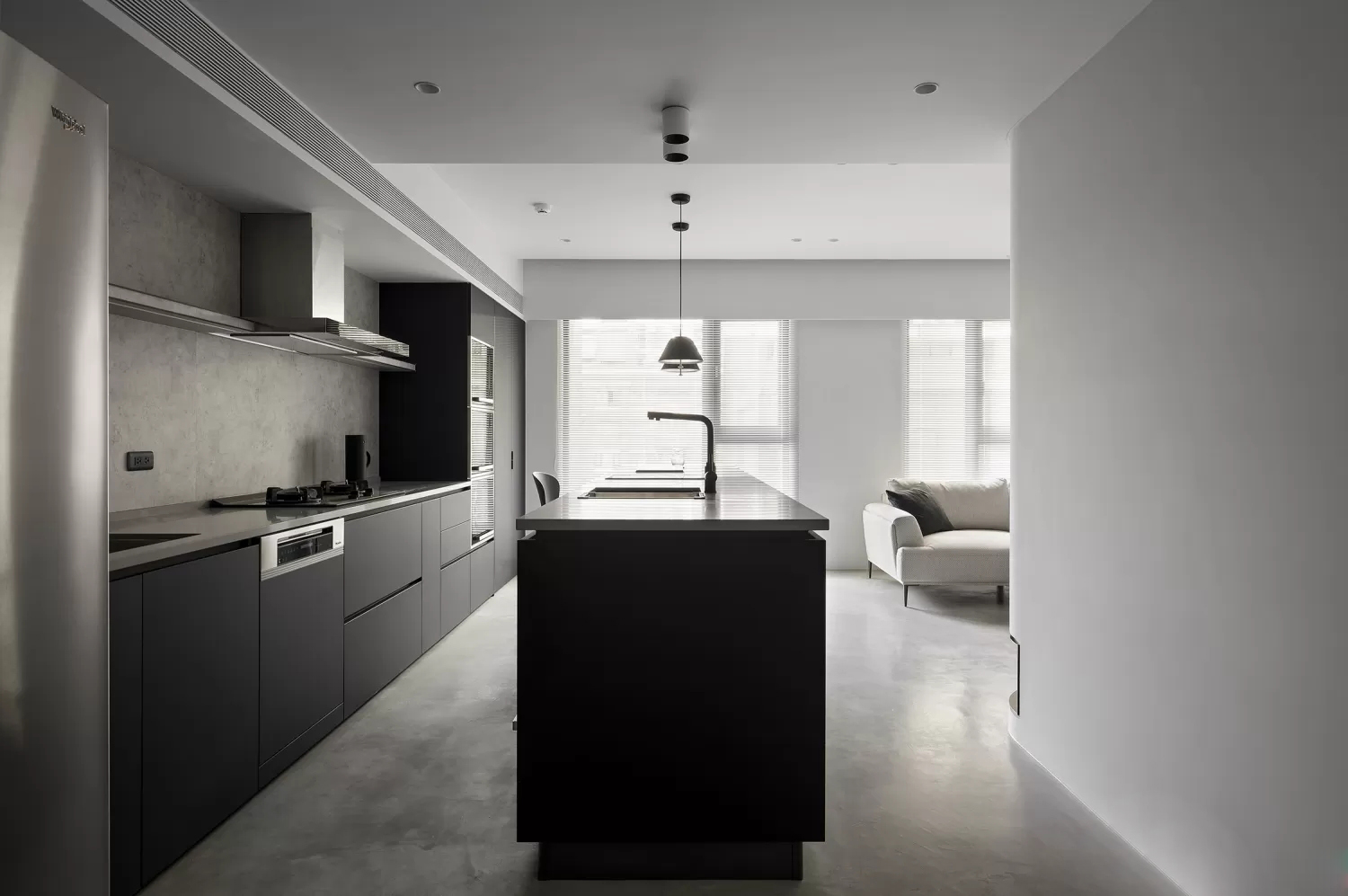 这组空间是极简工业风与柔和质感的平衡设计,用“冷调基底+细节柔化”打造出高级又舒适的居住感: