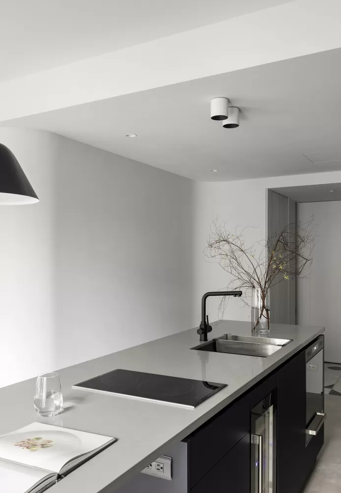 • 灯光是点睛之笔:黑色锥形吊灯+磁吸轨道灯,硬线条灯具和冷调空间呼应,暖光又能柔化冰冷感;岛台延伸出餐桌区,配一把极简黑灰吧椅,吃饭、办公都能兼顾。