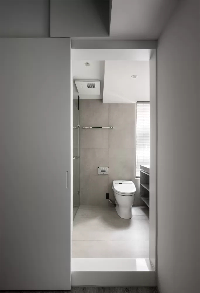 • 隐藏式光源+玻璃隔断,让小卫浴既通透又保持干湿分离,冷调里透着精致感。