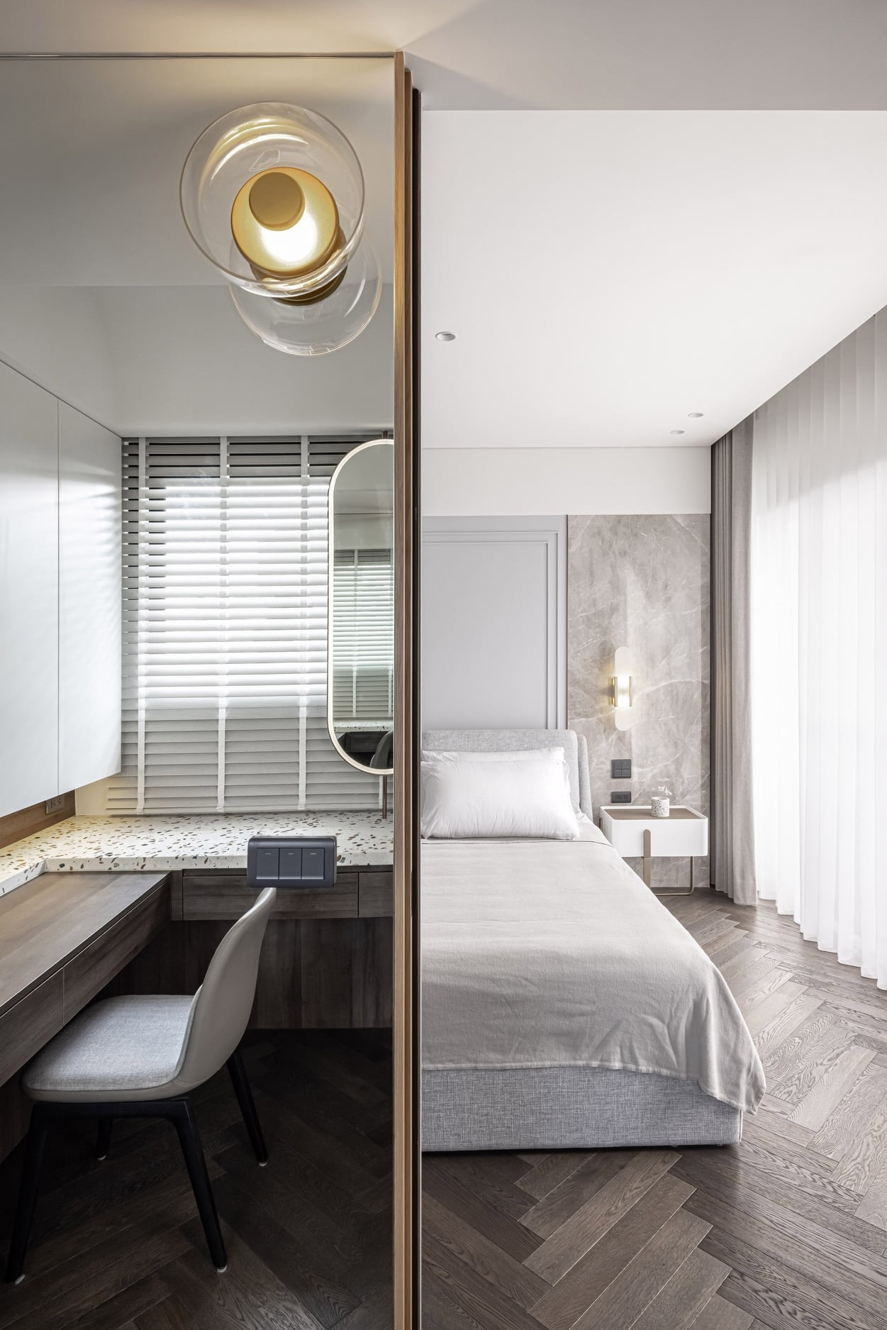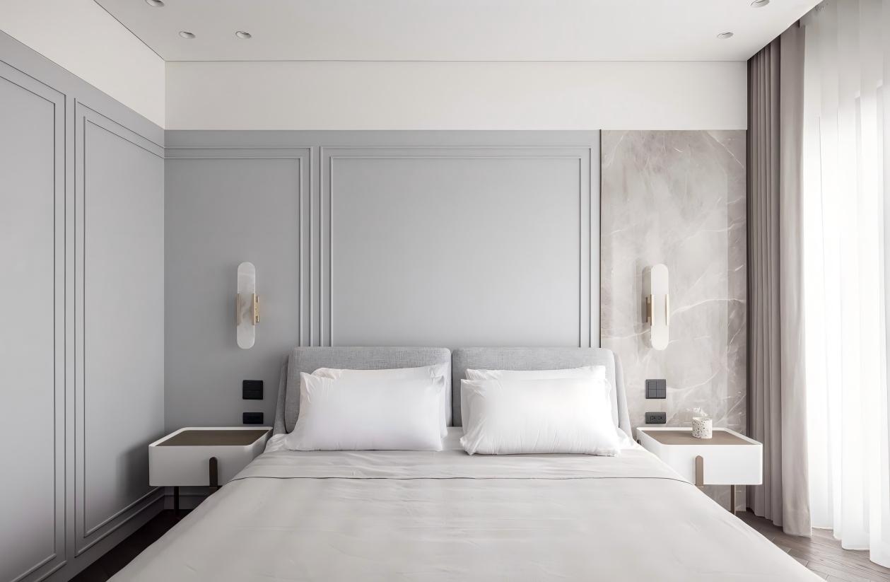 浅灰护墙+大理石纹背景墙显温柔,悬浮床头柜+玻璃壁灯让细节轻盈,无主灯设计+柔光纱帘,把休憩空间的静谧感拉满,是“躺下就能放松”的氛围。