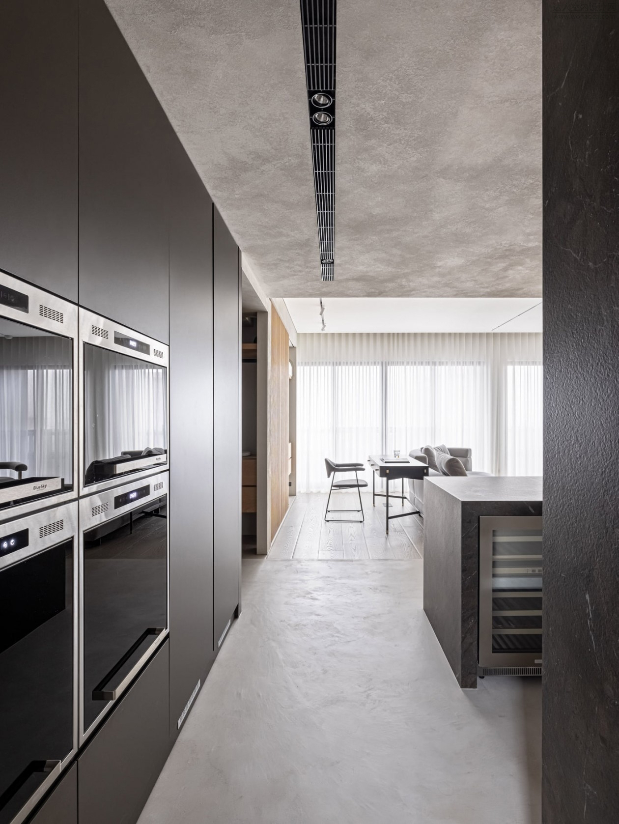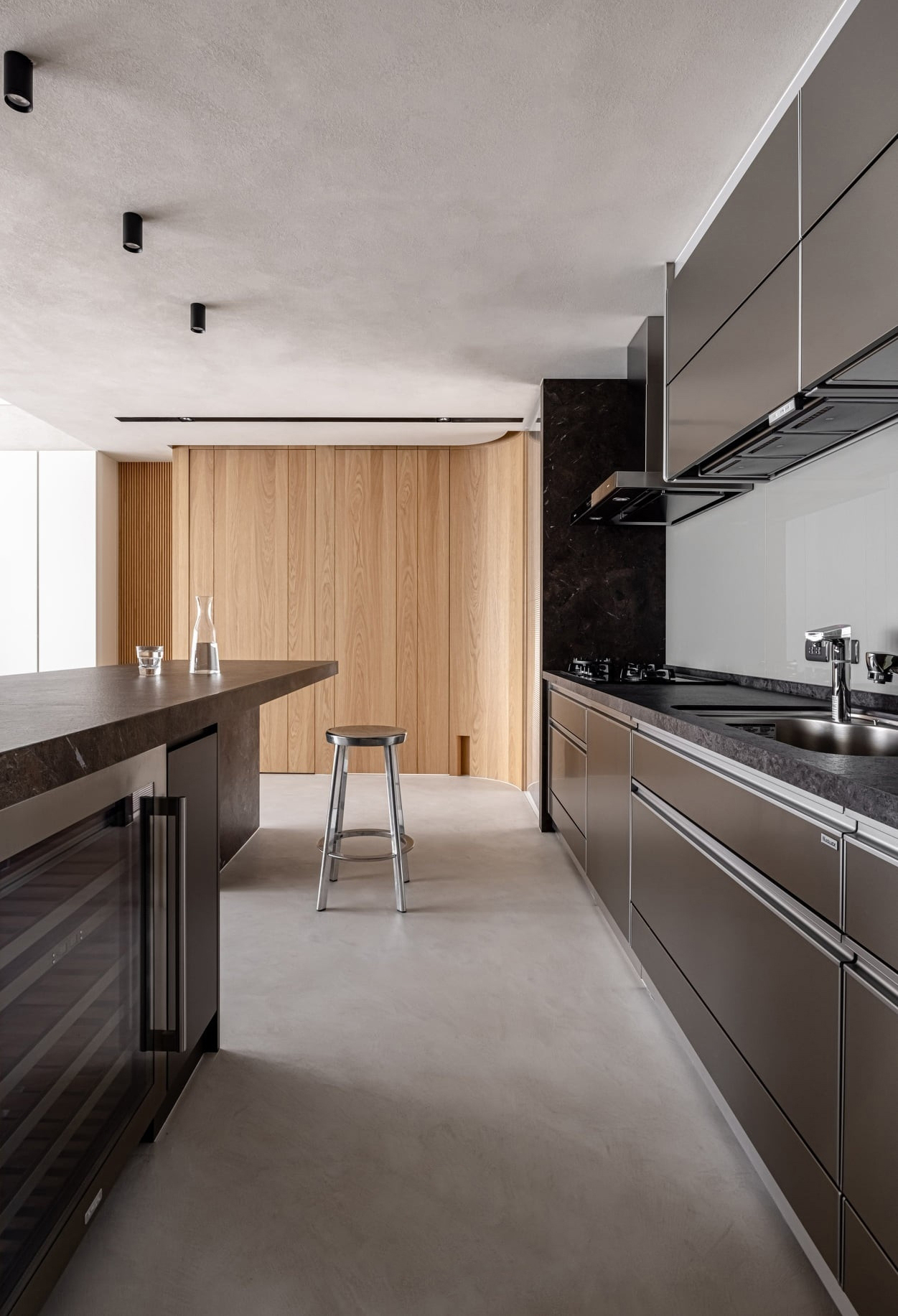 深灰橱柜+黑色岩板台面自带利落感,木纹护墙与金属小凳中和冷调,弧形转角设计柔化了空间棱角,既保留了极简的规整,又添了生活的松弛。