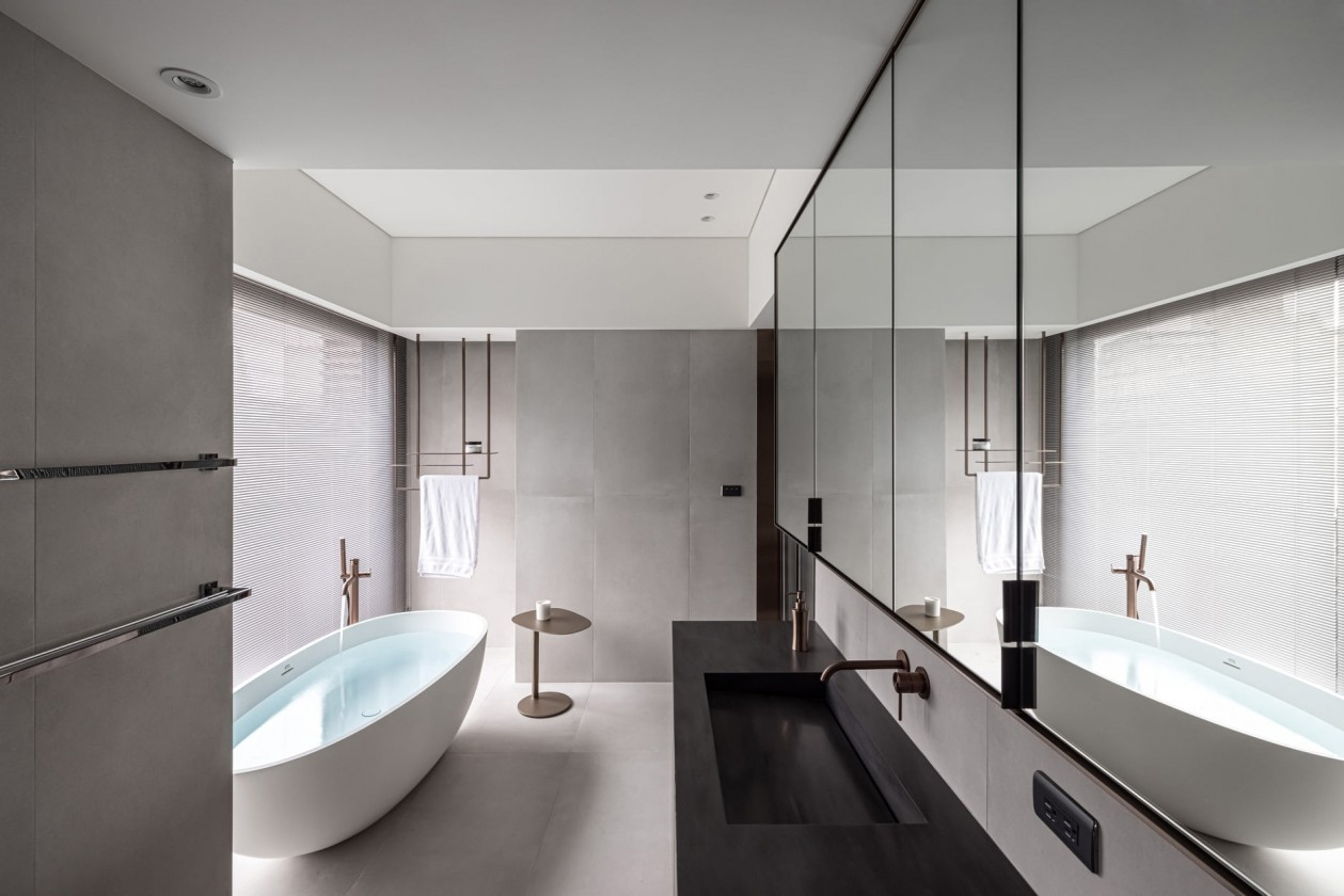 木纹浴室柜+黑色台盆碰撞出层次,嵌入式灯光与独立浴缸提升精致度,百叶帘既保证隐私又不挡光,把“日常洗漱”变成了舒适的仪式感。