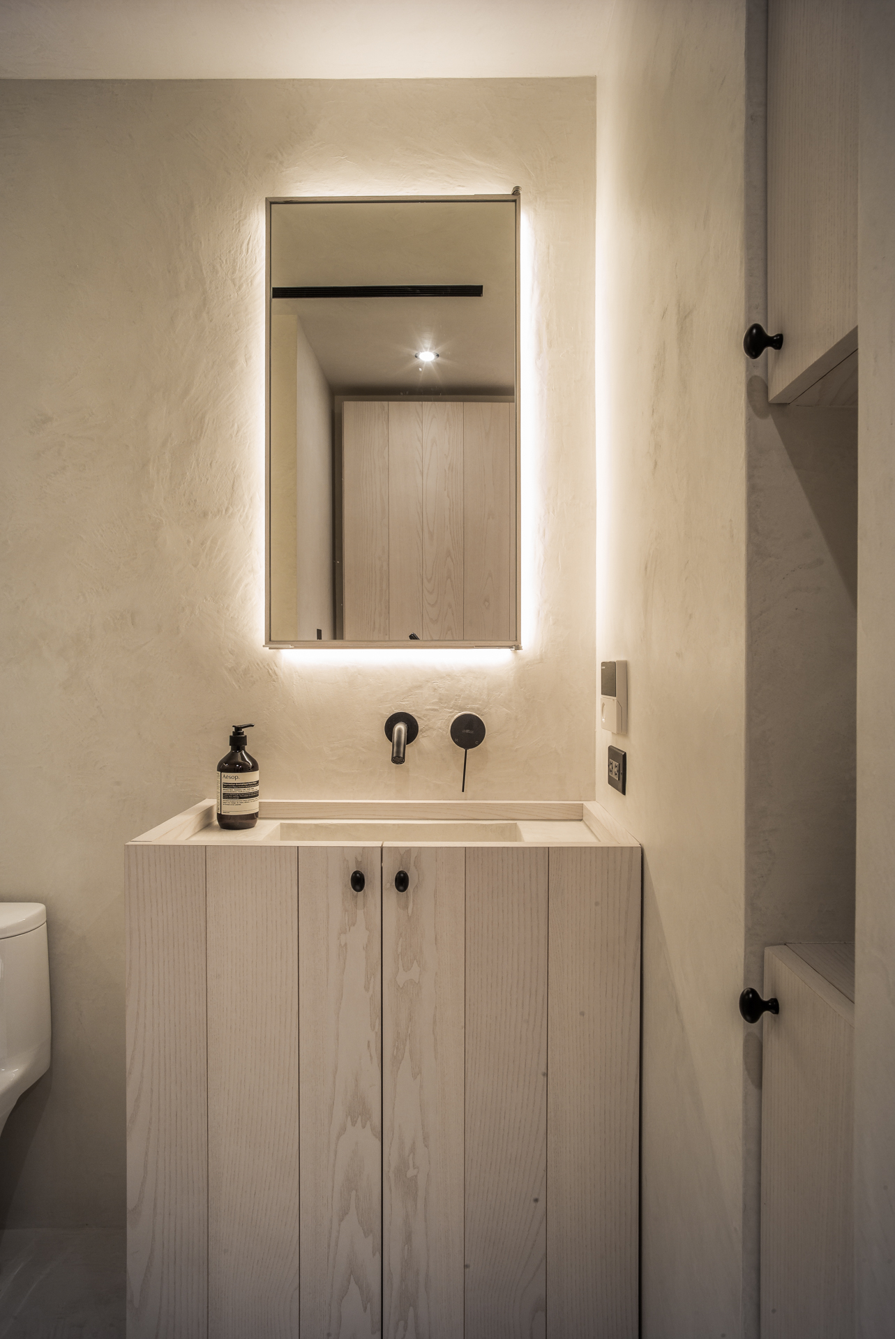 • 卫浴:一体台盆+肌理墙面,黑框镜+暗藏灯带,简约里透着高级质感