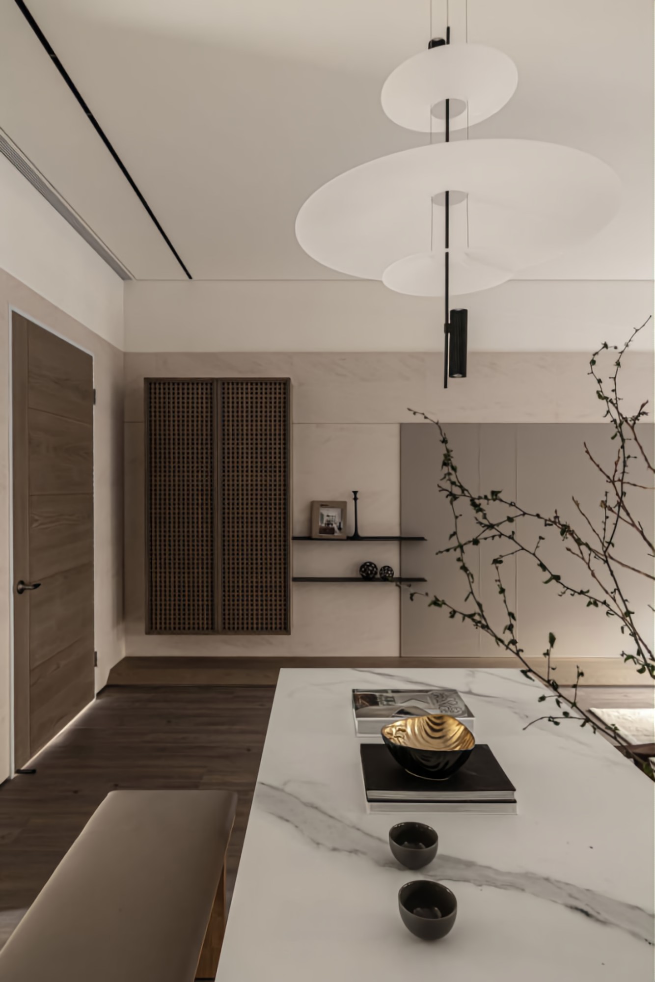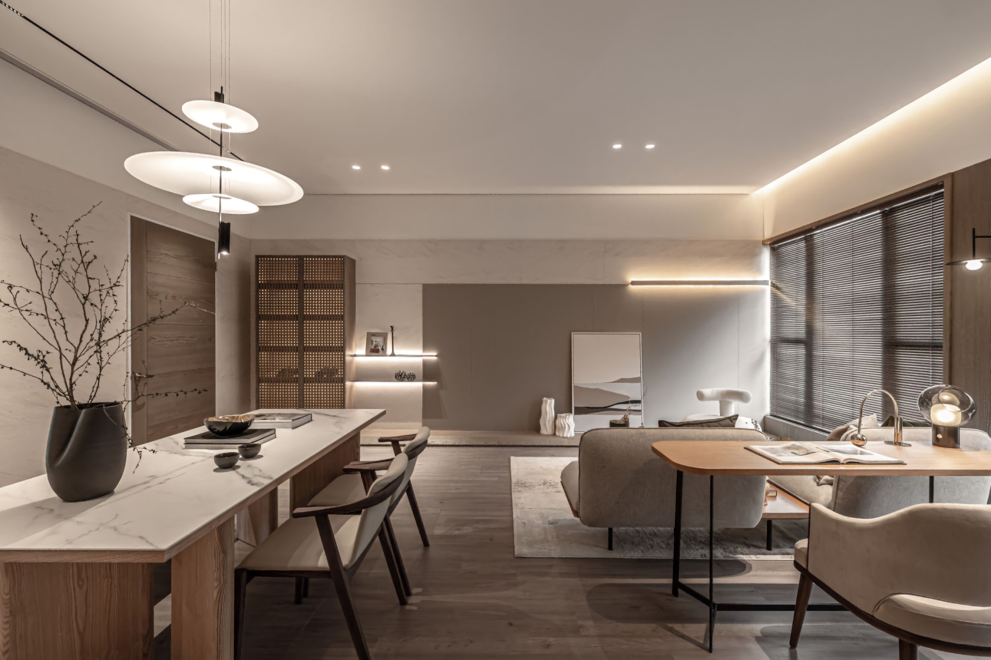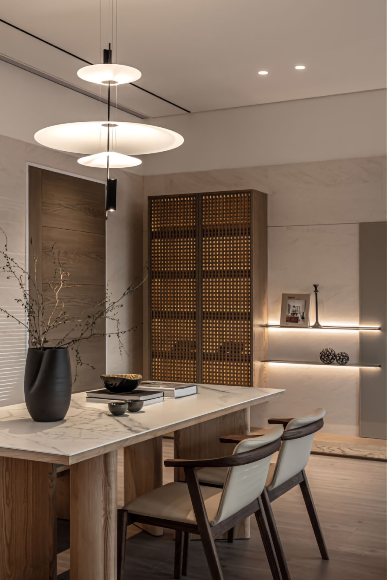 • 餐厨区:木纹+大理石餐桌质感拉满,格栅柜藏灯带,暖光里透着东方禅意;层次吊灯柔化空间,摆件简约却显品味