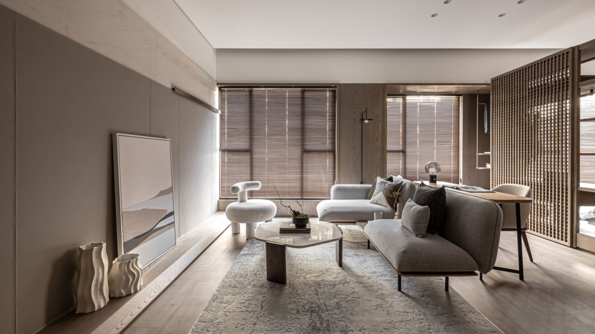 • 客餐厅:低饱和灰调软装+木质百叶窗,格栅隔断既通透又划分区域;软装线条柔和,自带松弛氛围感