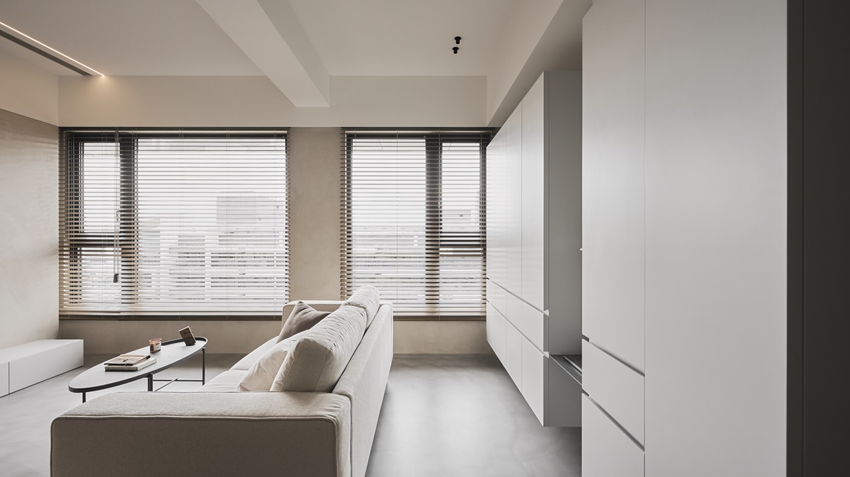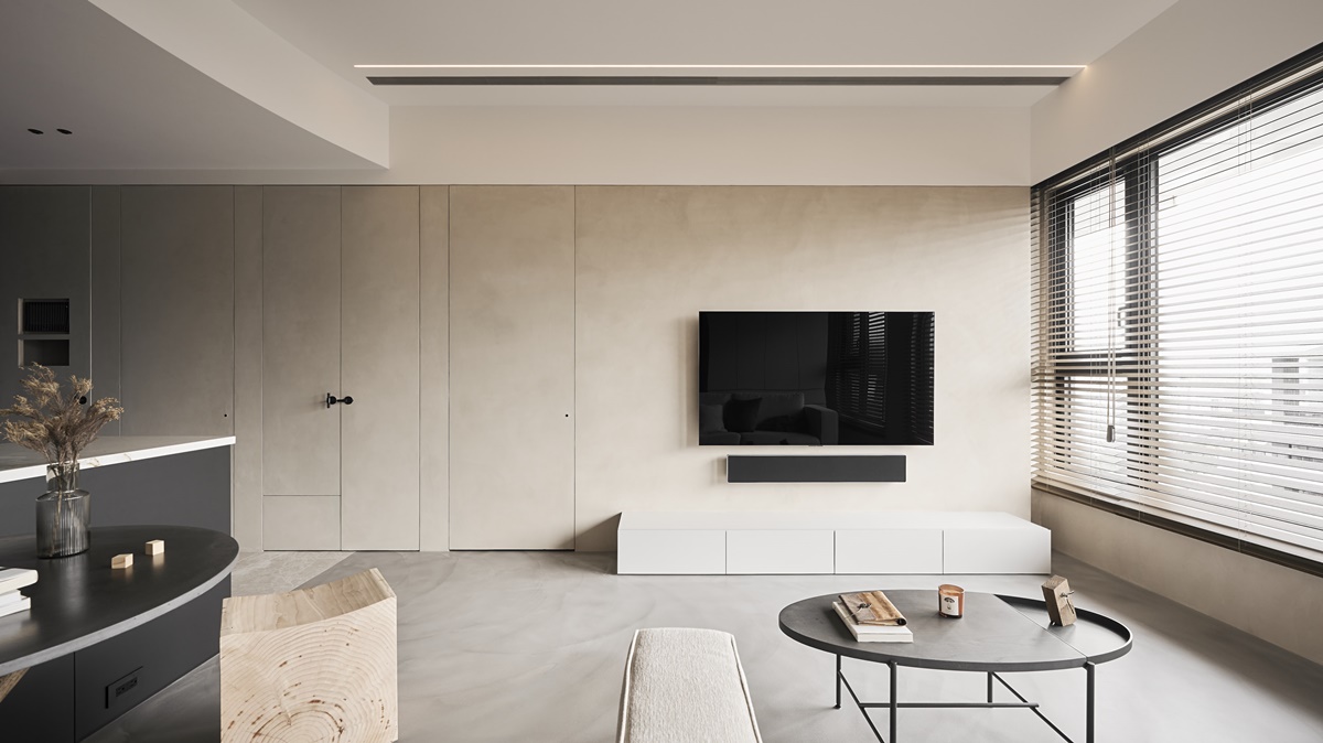 • 客厅:浅卡其艺术涂料墙+水泥灰地面,弱化空间边界;无主灯+磁吸轨道灯+筒灯分层布光,柔和不刺眼;整面百叶窗既保证采光又能调节隐私,搭配悬浮电视柜+低矮沙发,视觉上更显开阔。