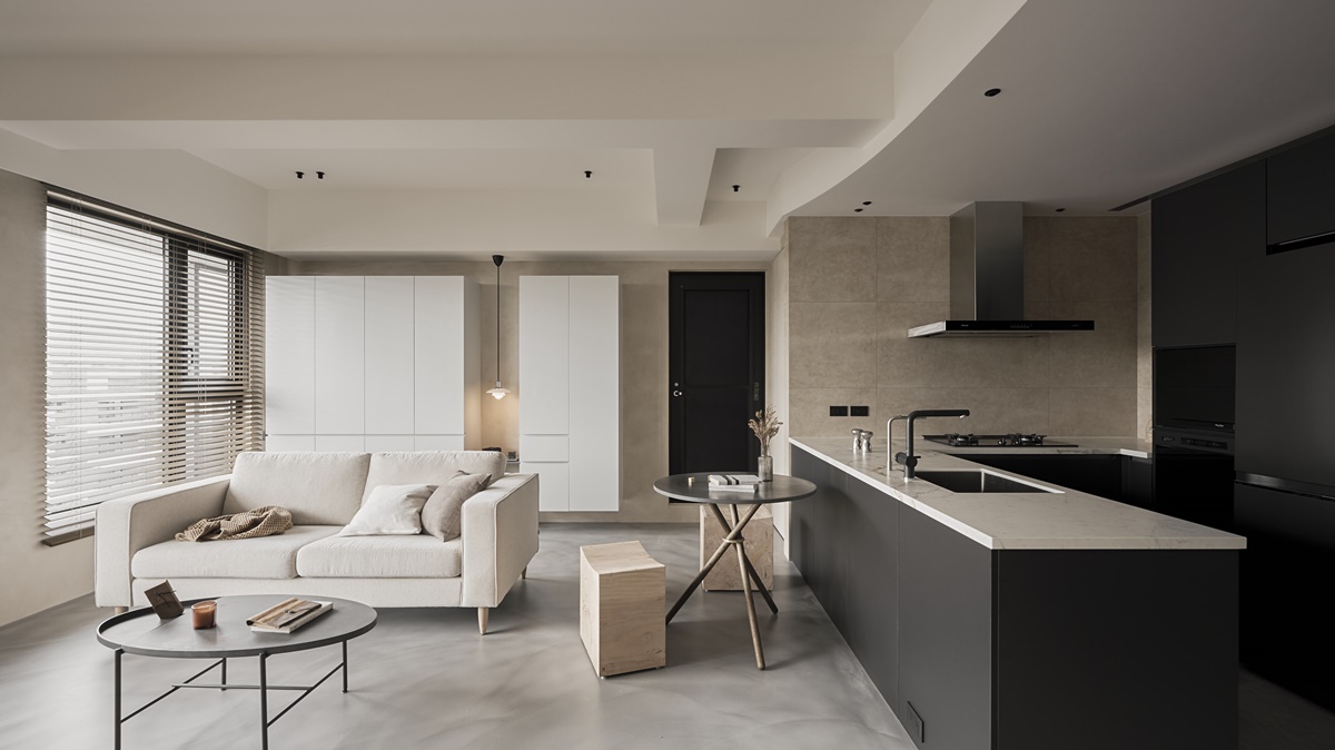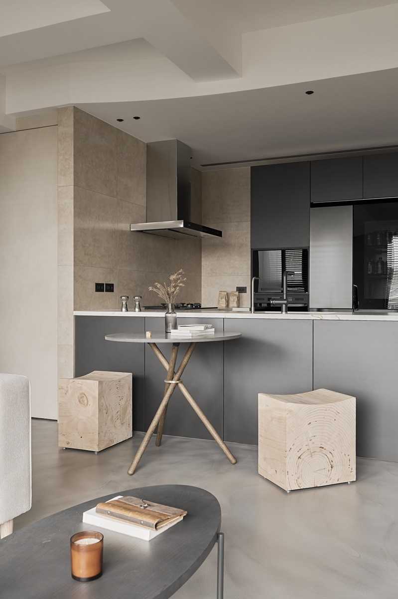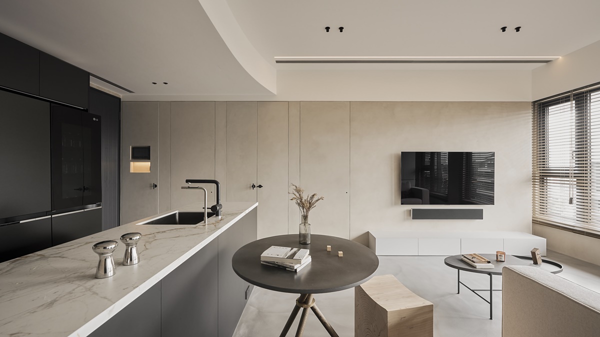 这套空间是**“极简侘寂+现代功能”**的融合设计,从公区到私域都藏着细腻的巧思: