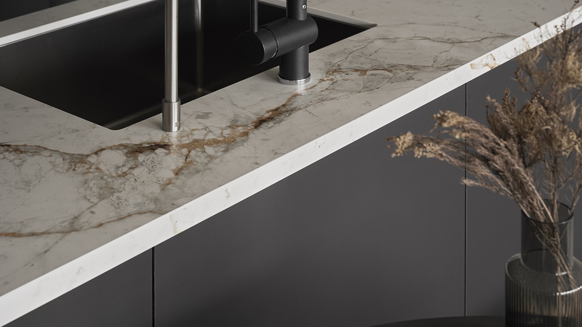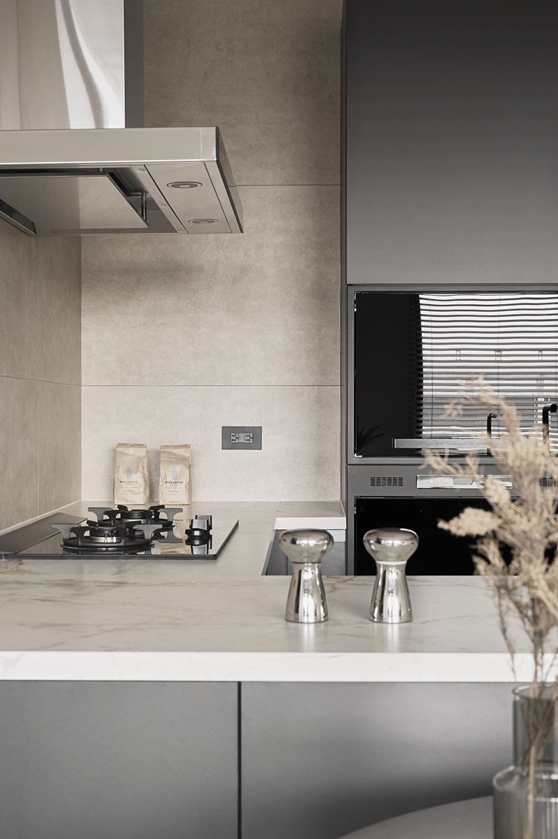 • 台面用一体盆+黑色龙头,搭配局部木色收纳格,在冷硬质感里加入柔和细节。