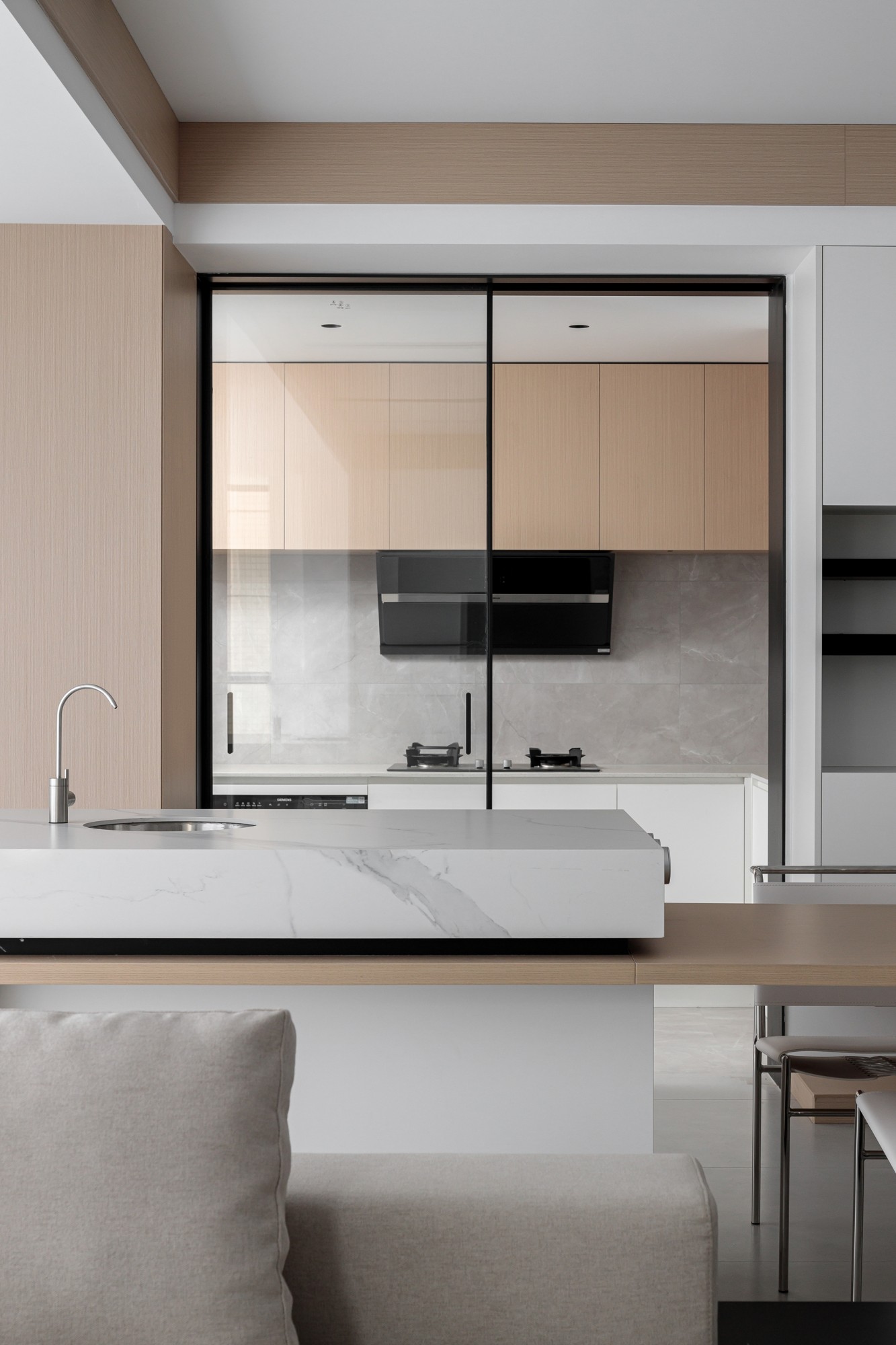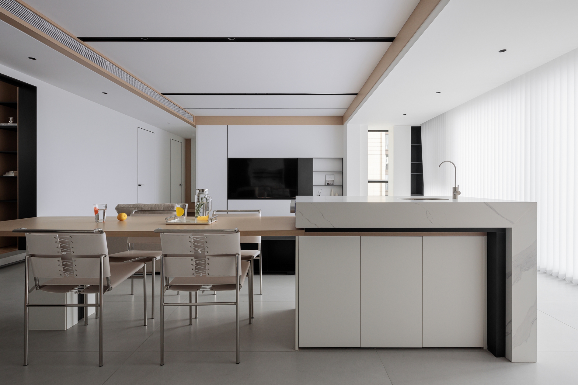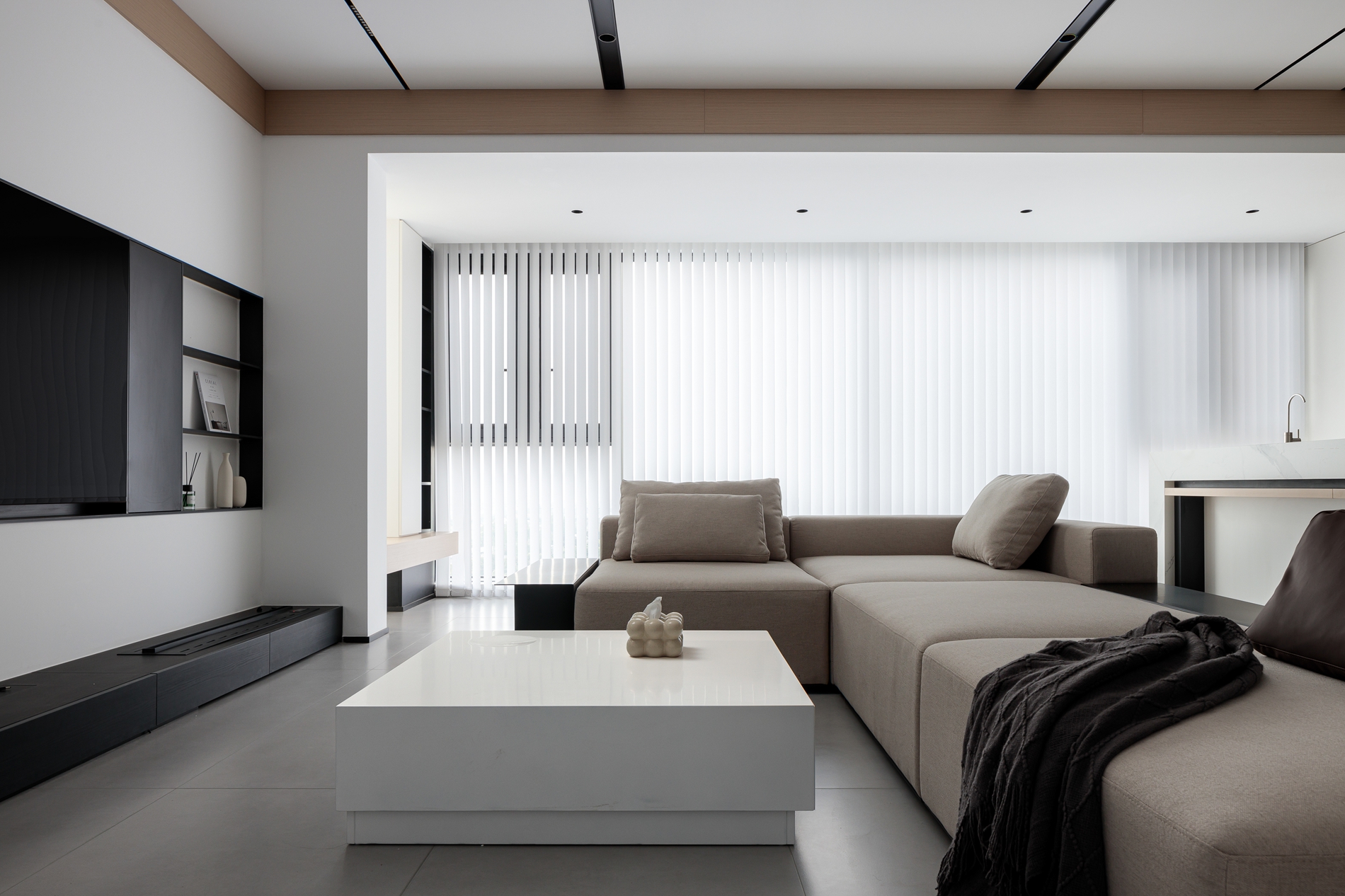 浅卡其L型沙发+白色岩板茶几,用低饱和色系铺出柔和基底,搭一条深灰毛毯增加层次;电视墙做了“悬浮柜体+嵌入式电视”,黑色开放格点缀摆件,下方长形地台藏住线路;顶面的黑色线性灯+木色吊顶,和地面浅灰大砖形成“上轻下稳”的呼应;玻璃百叶帘把自然光柔化后铺满空间,和餐厨区的隔断设计让视线完全打通,整个公共区既开阔又显温馨。