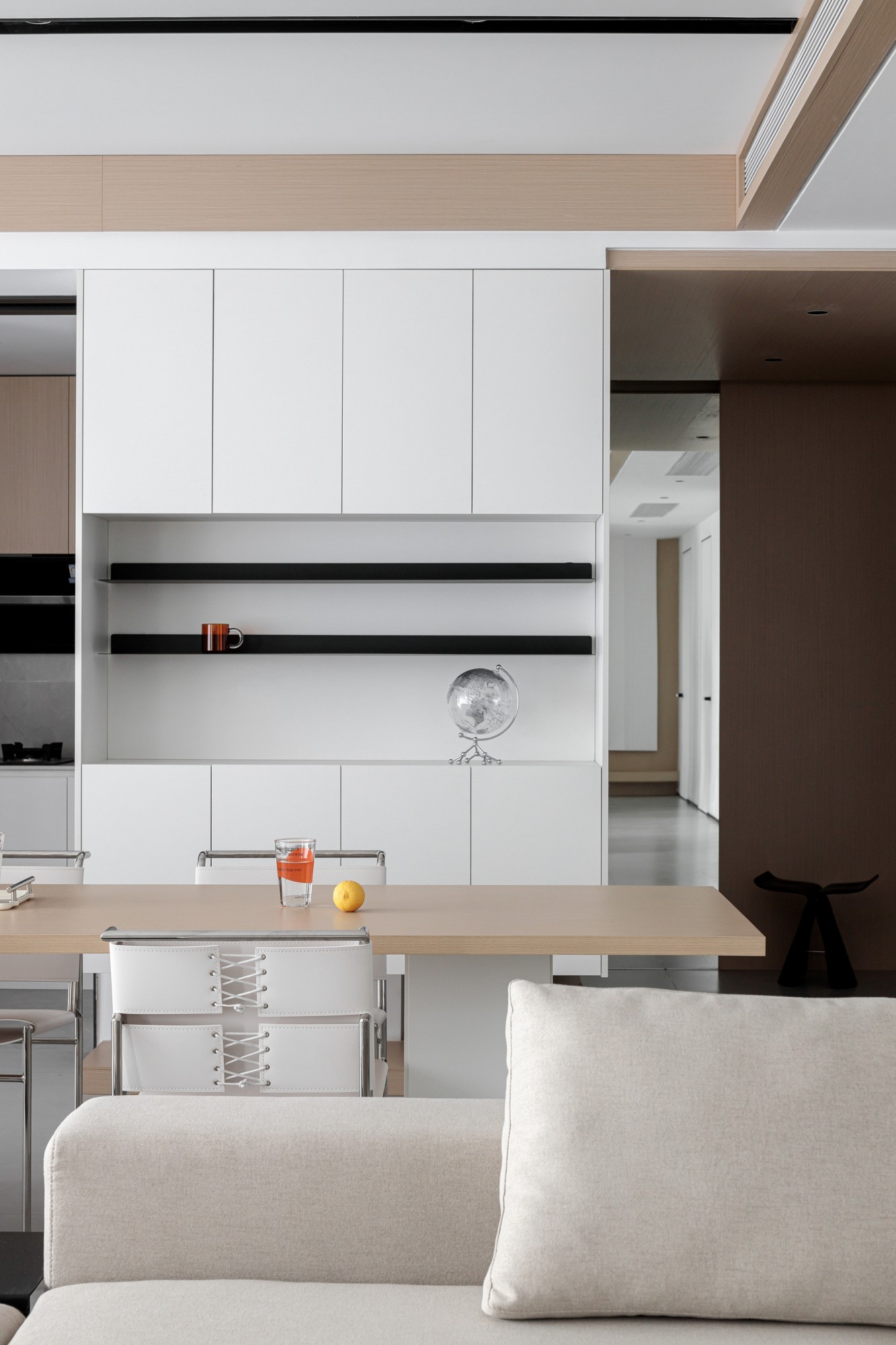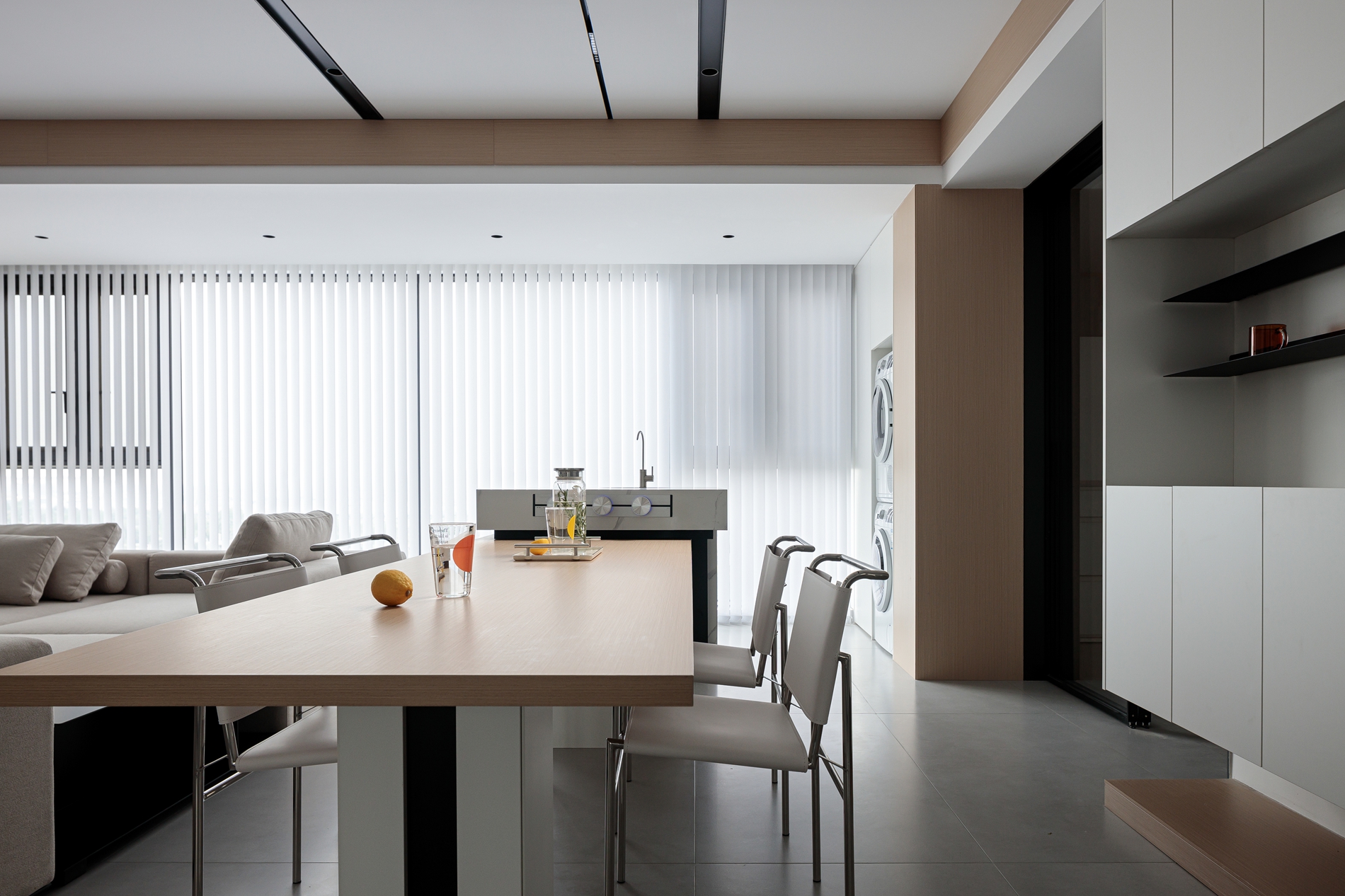 原木色餐桌搭配金属框餐椅,质感轻盈不笨重;旁边的中岛台做了灰色岩板台面,兼顾备餐+收纳;更巧妙的是把洗衣机/烘干机藏在木色立柱旁的玻璃门后,既不破坏整体调性,又解决了小户型家政区的痛点;墙面的黑白悬浮柜+极简层板,用“少即是多”的思路,让餐厨区清爽又实用。