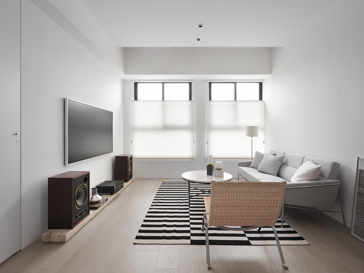 • 客厅:大面积白墙+浅木色地板,搭配浅灰沙发与黑白条纹地毯,既清爽又带点利落的线条感;隐藏式柜体+嵌入式家电,让视觉更整洁。