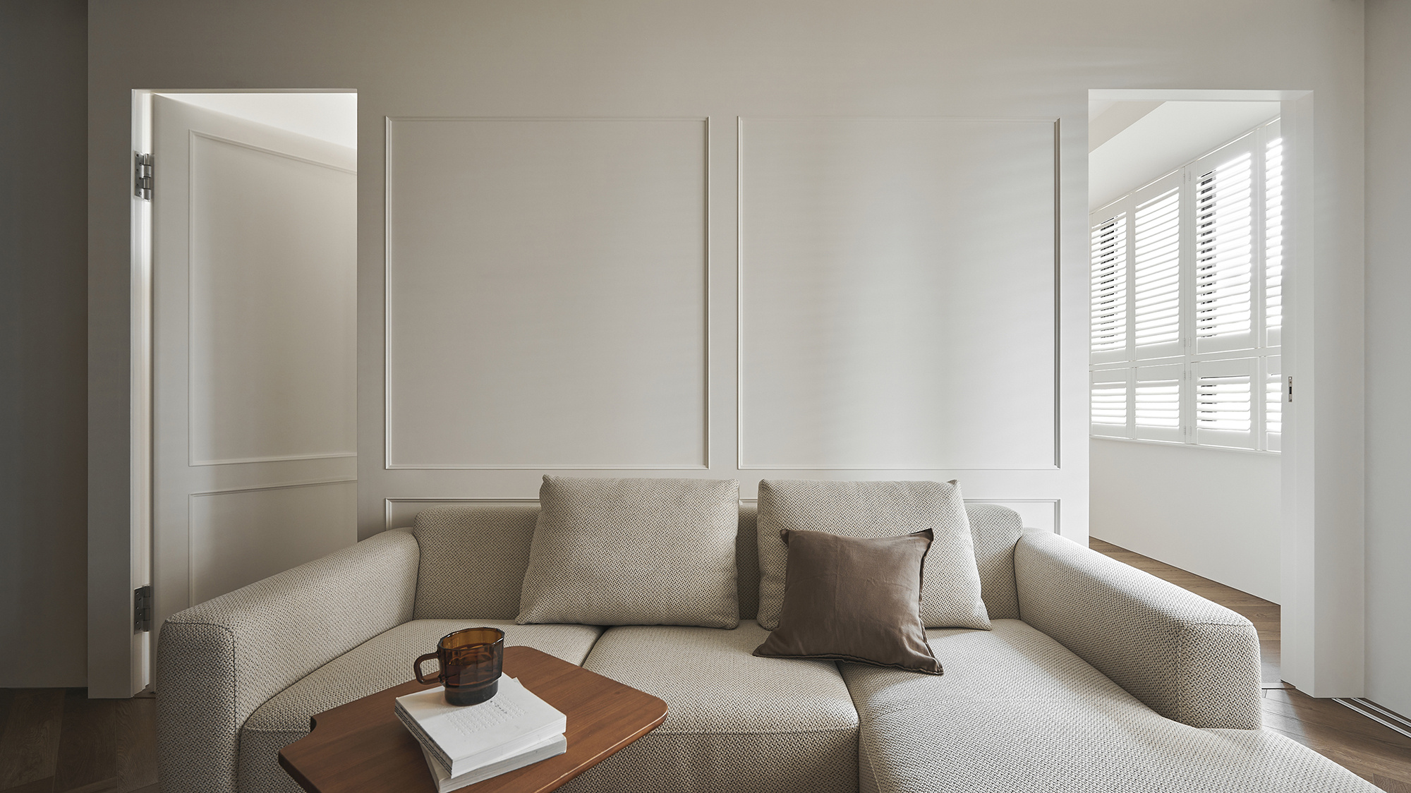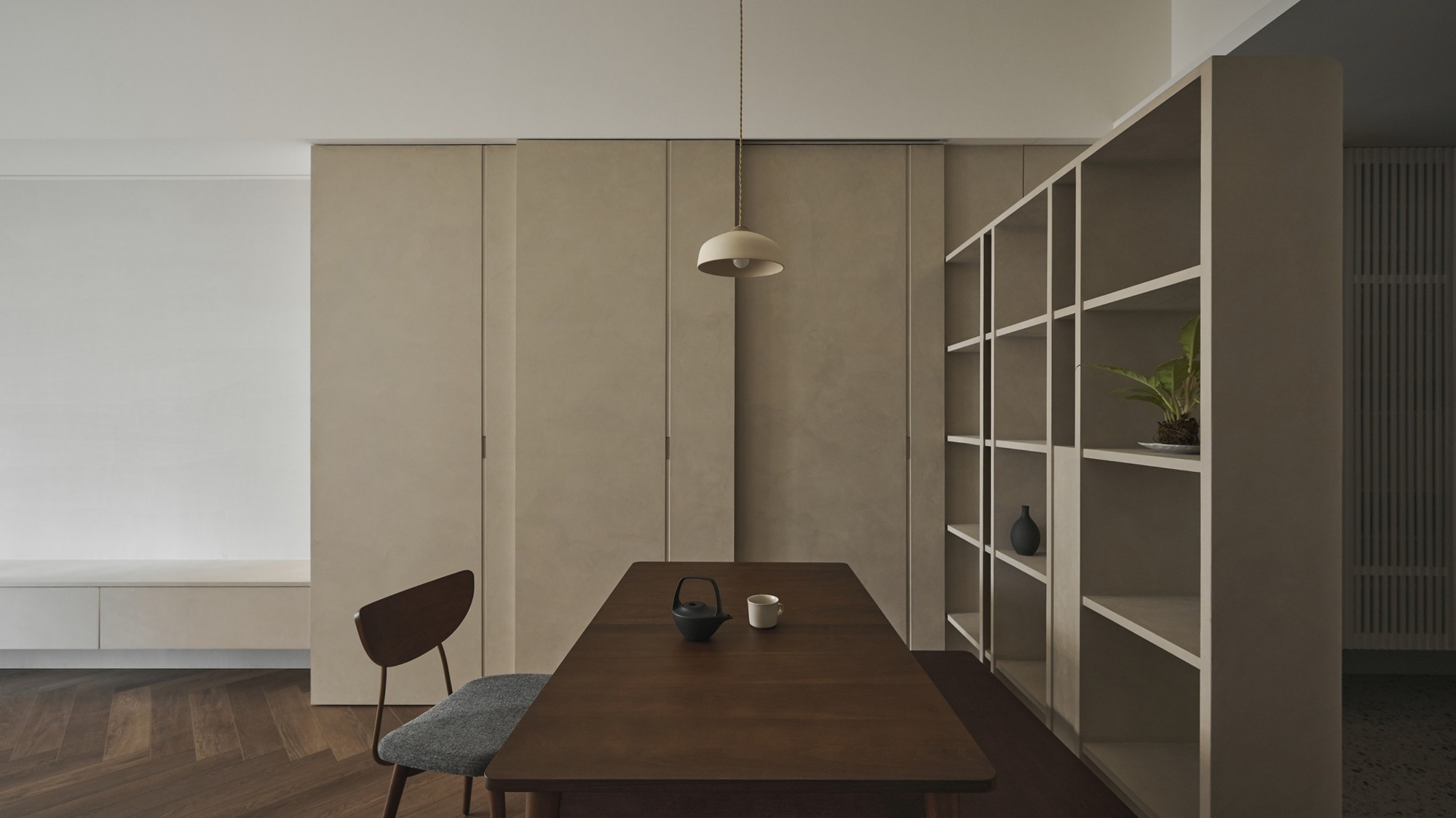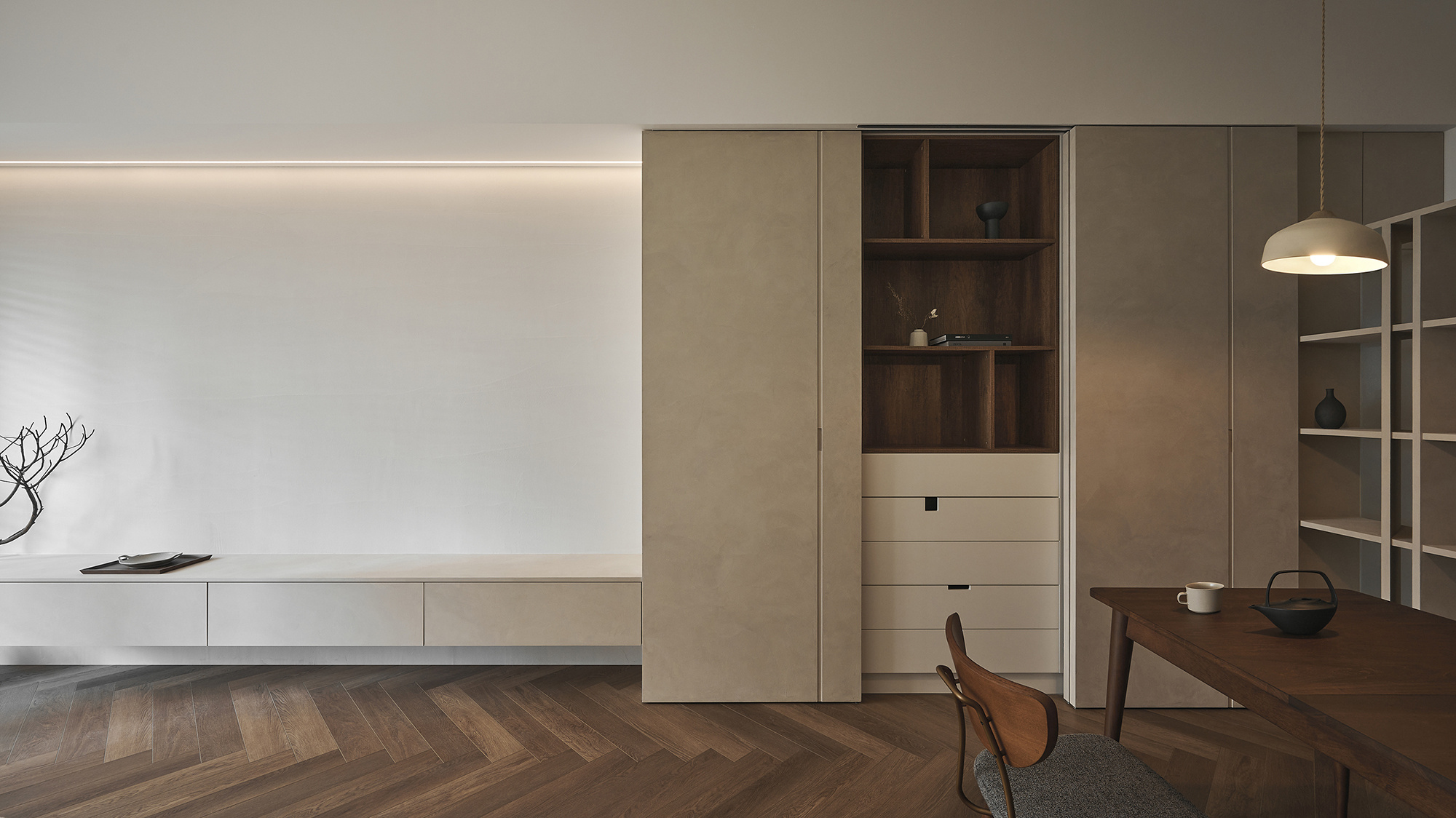 这是一套暖调极简风住宅,以浅米色、木色为主调,通过统一材质与隐形式设计营造柔和松弛的氛围,: