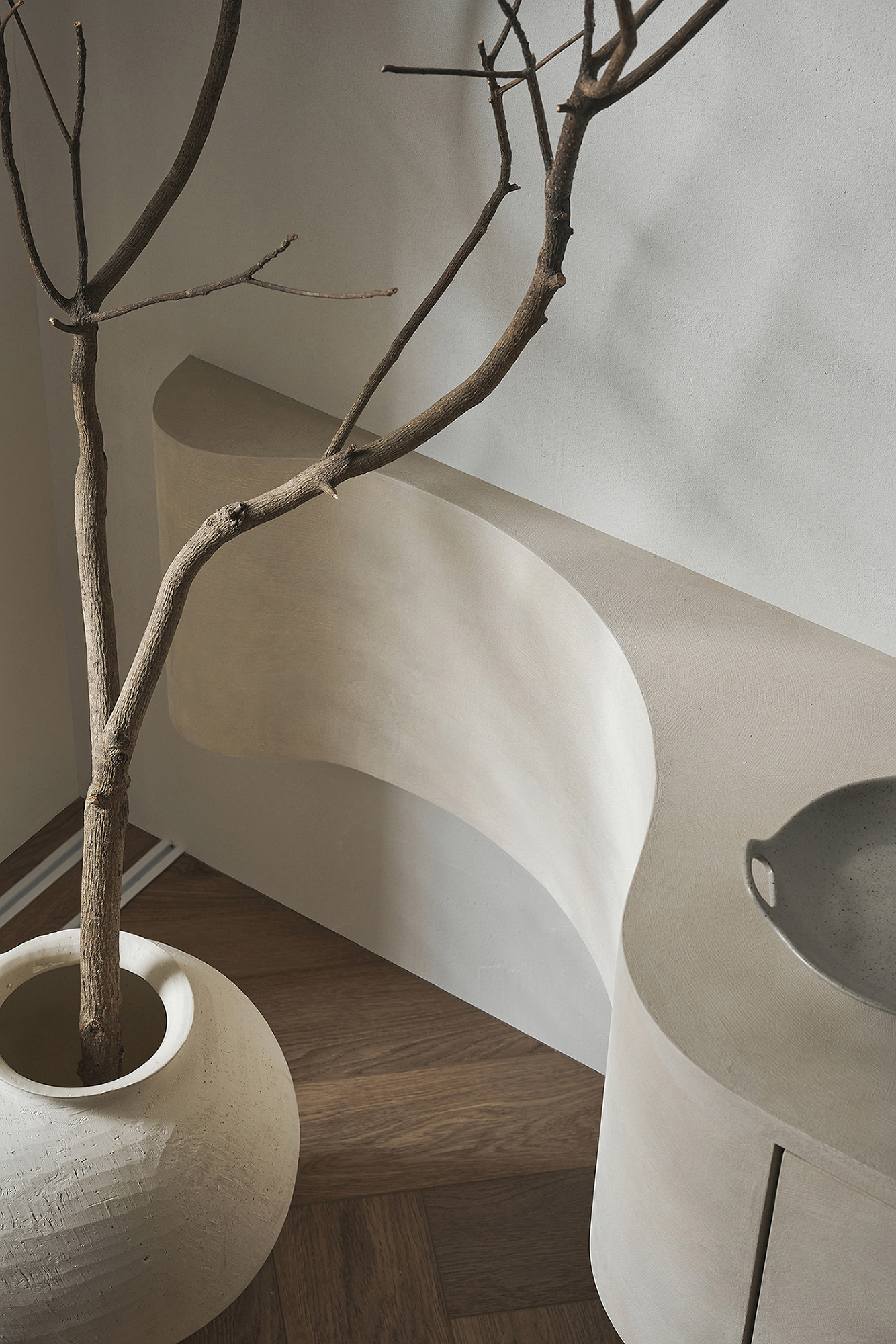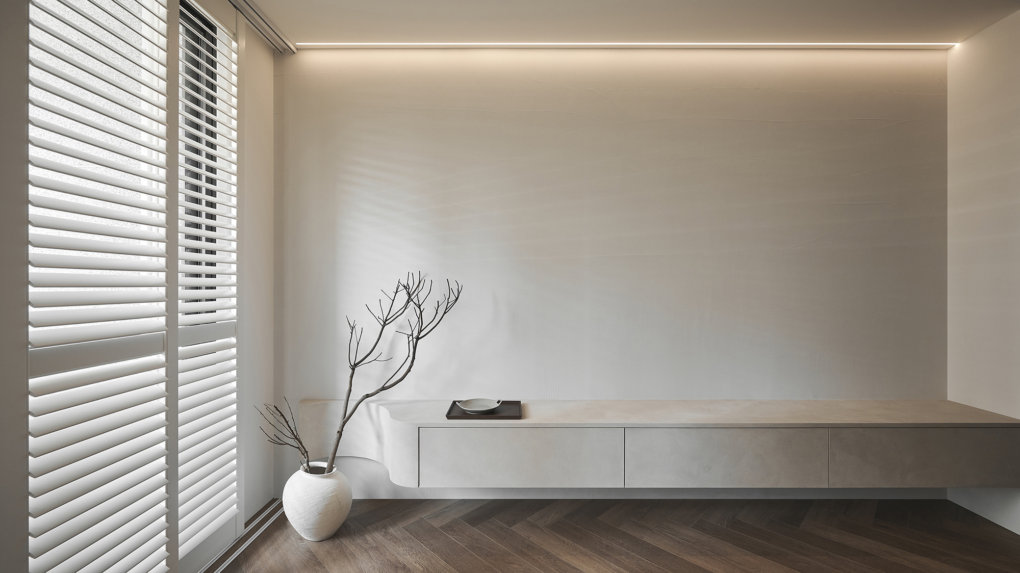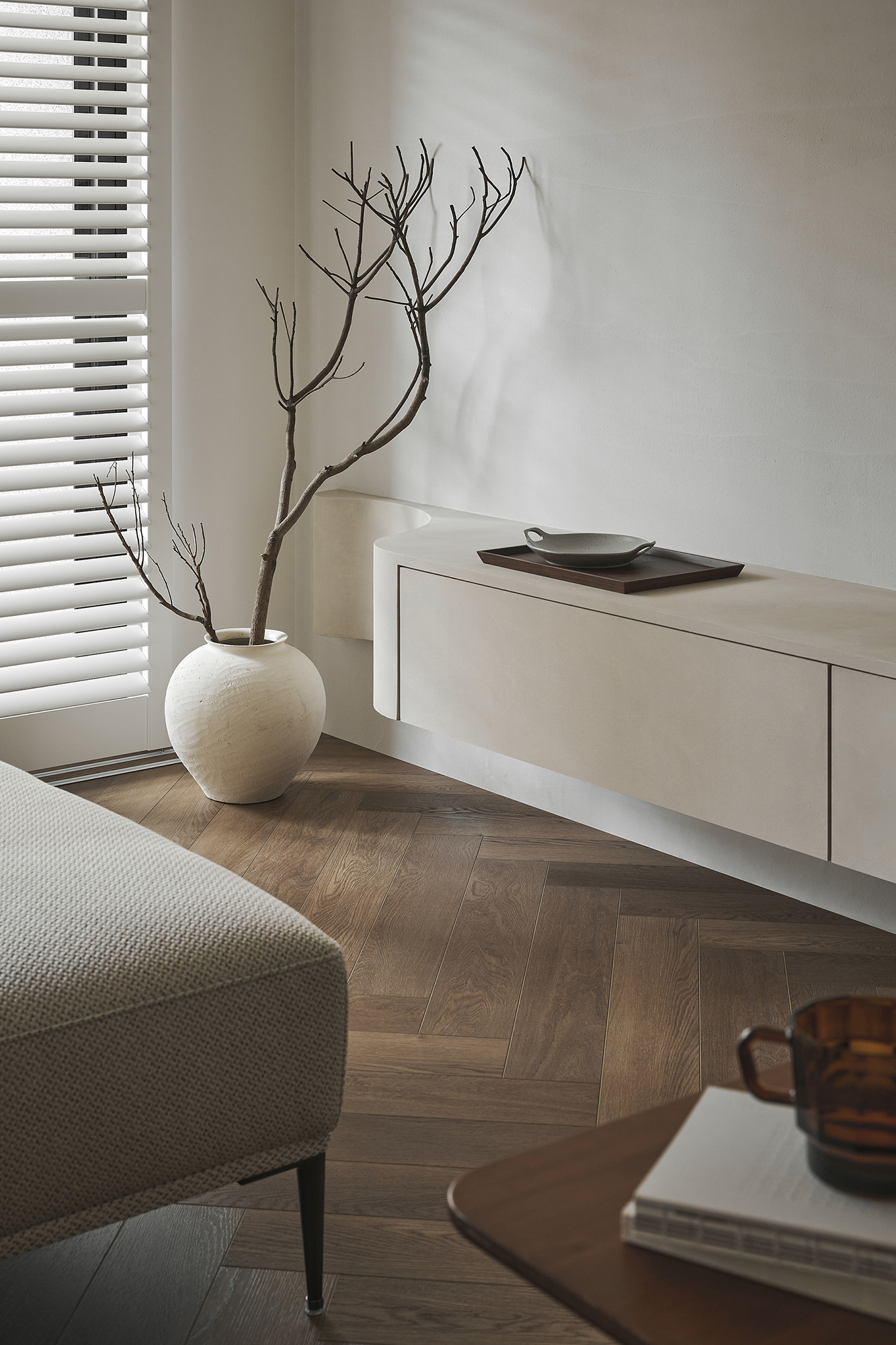 浅肌理墙面+人字拼木地板,搭配低饱和布艺沙发,弱化硬质线条; 通顶百叶窗柔化光线,局部置物柜+枯枝装饰平衡简约与温度。