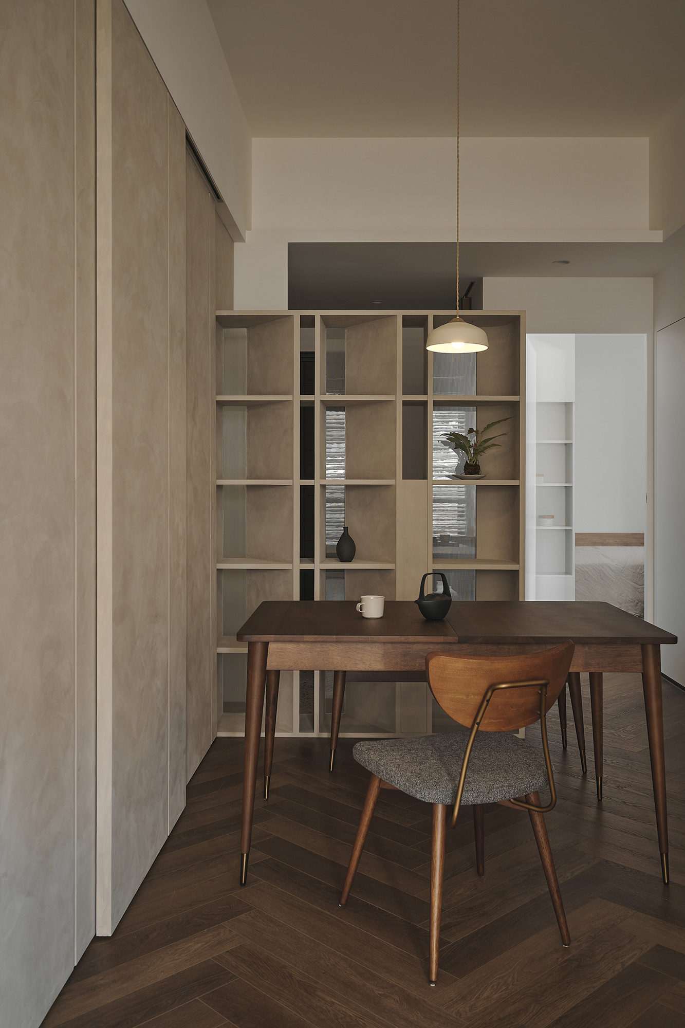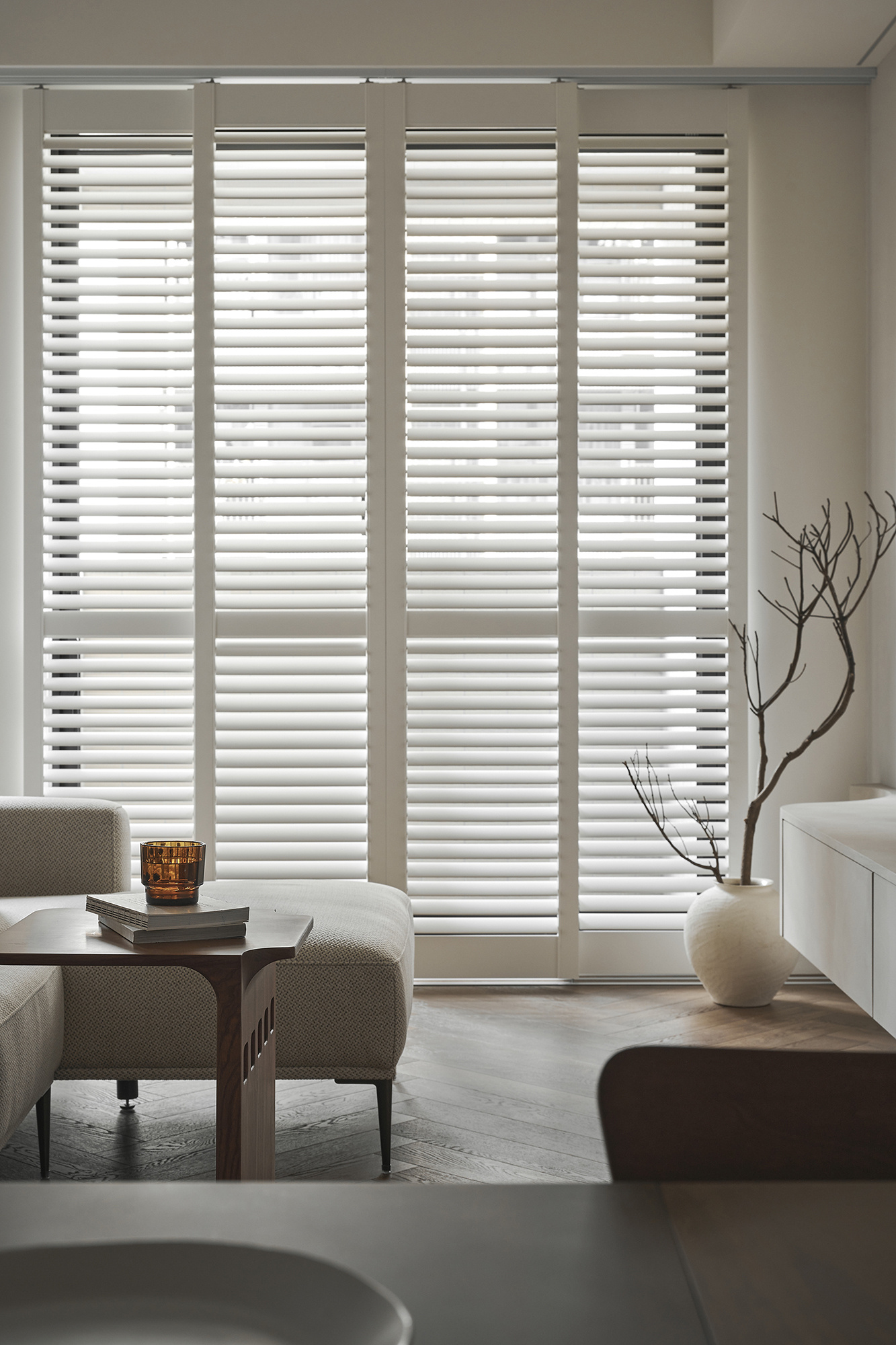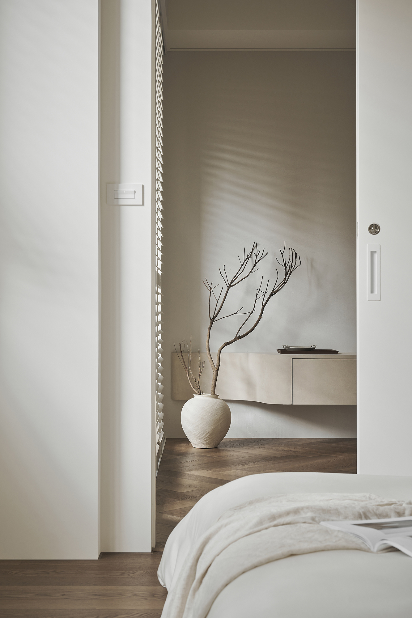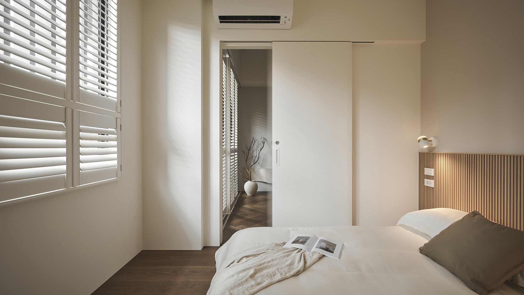 整面定制柜+隐形门设计,最大化利用空间;局部木质格栅床头+嵌入式灯光,在极简中增加温馨细节,百叶窗保证隐私同时引入自然光。